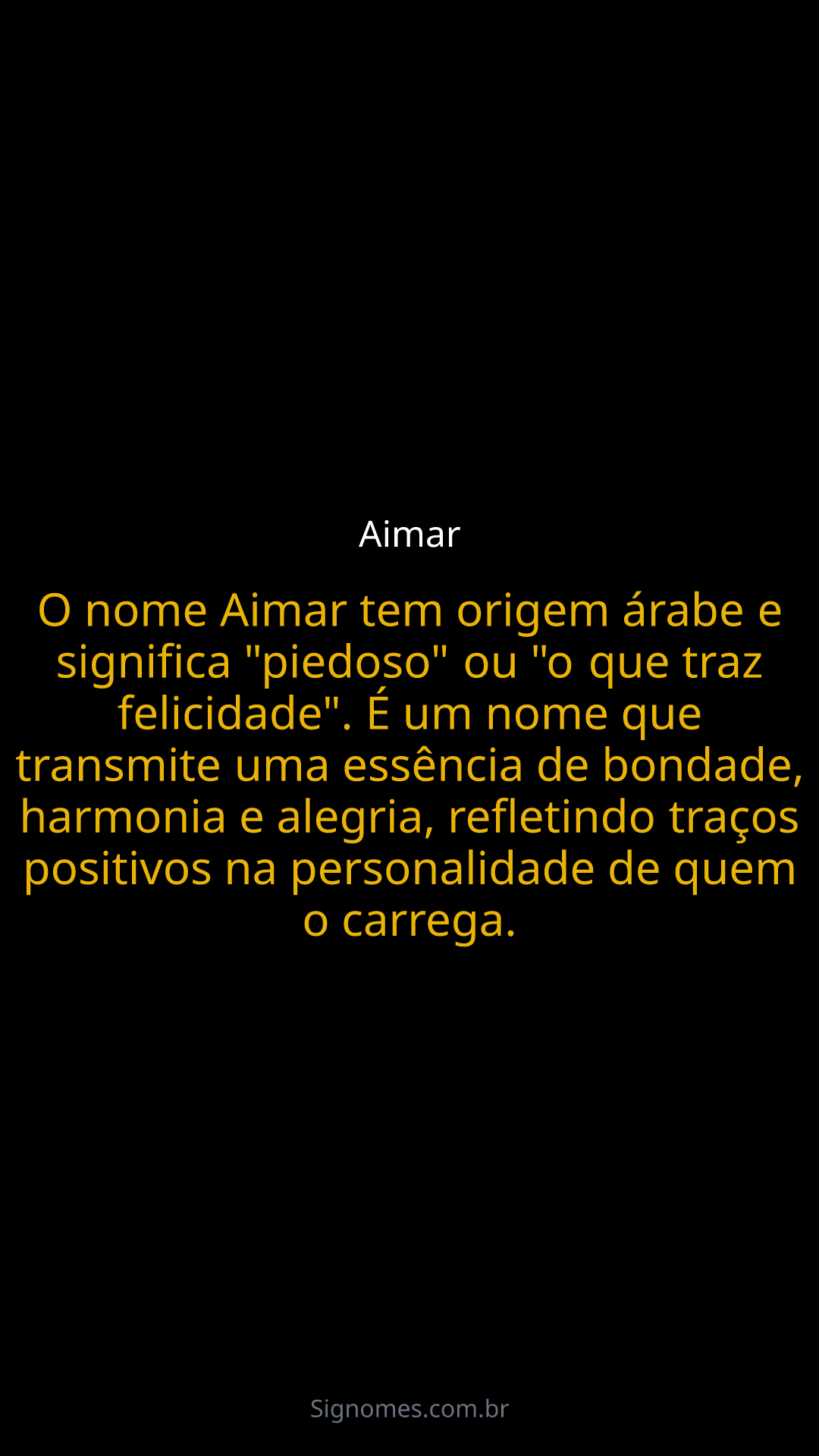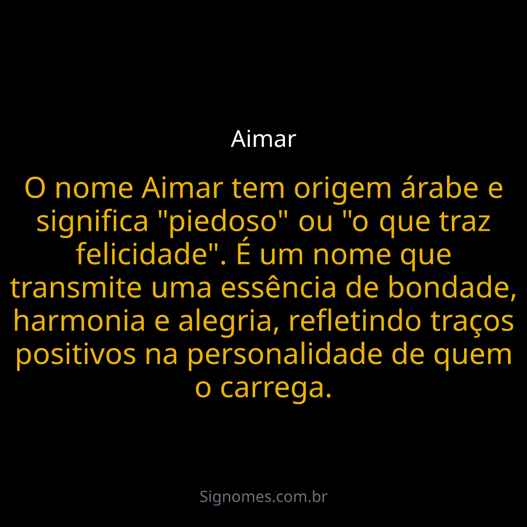 O nome Aimar tem origem árabe e significa "piedoso" ou "o que traz felicidade". É um nome que transmite uma essência de bondade, harmonia e alegria, refletindo traços positivos na personalidade de quem o carrega.