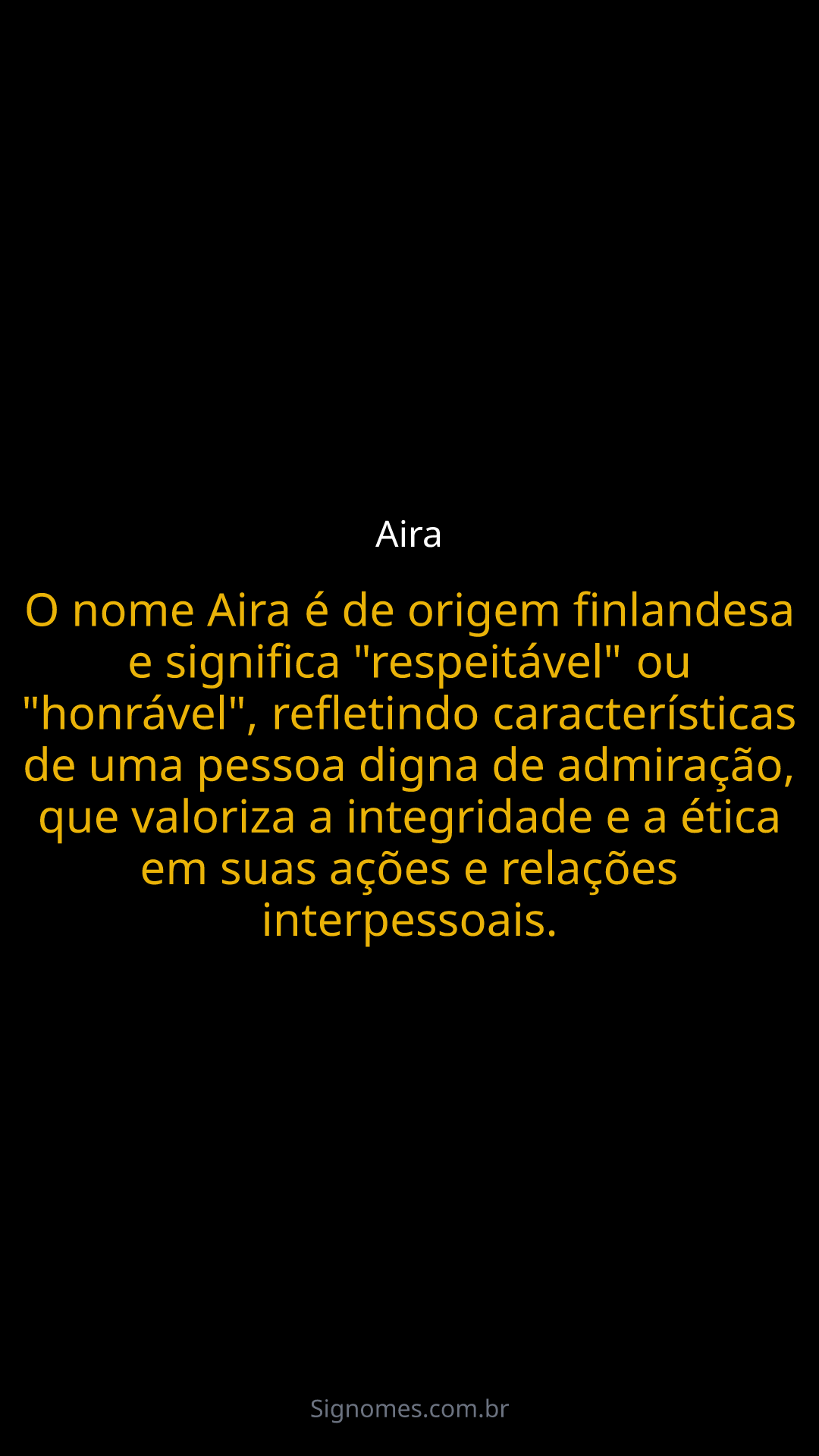 O nome Aira é de origem finlandesa e significa "respeitável" ou "honrável", refletindo características de uma pessoa digna de admiração, que valoriza a integridade e a ética em suas ações e relações interpessoais.
