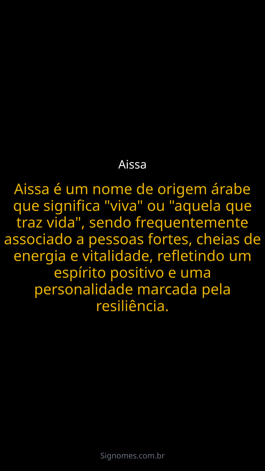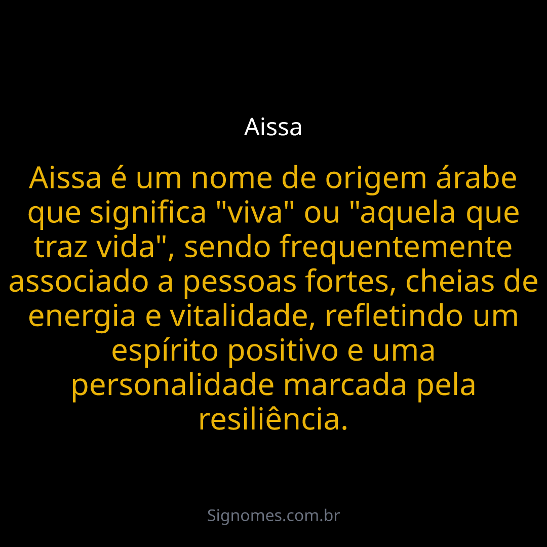 Aissa é um nome de origem árabe que significa "viva" ou "aquela que traz vida", sendo frequentemente associado a pessoas fortes, cheias de energia e vitalidade, refletindo um espírito positivo e uma personalidade marcada pela resiliência.