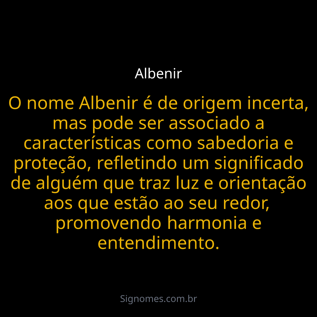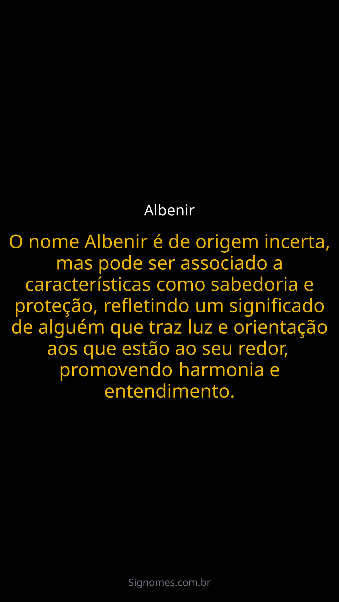 O nome Albenir é de origem incerta, mas pode ser associado a características como sabedoria e proteção, refletindo um significado de alguém que traz luz e orientação aos que estão ao seu redor, promovendo harmonia e entendimento.