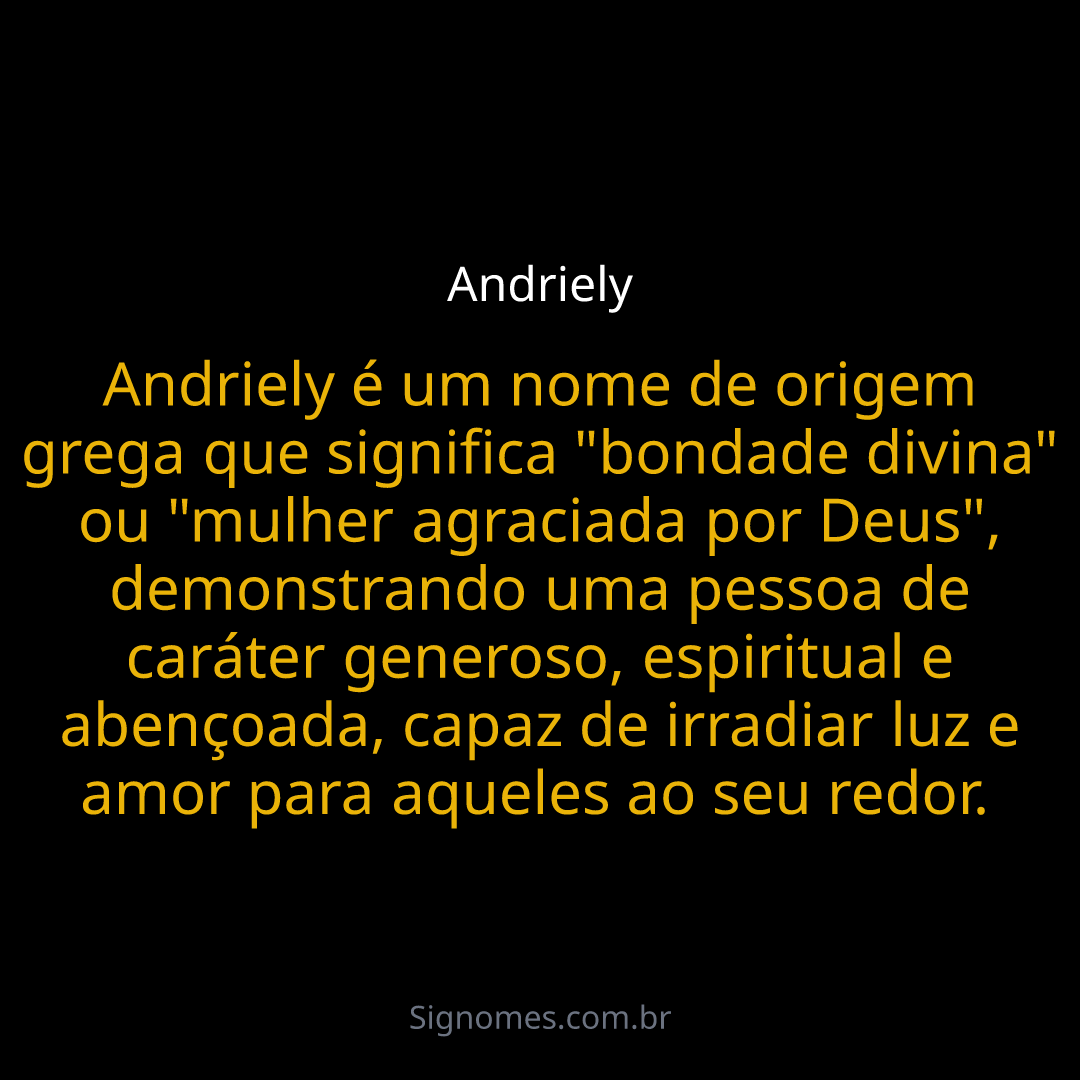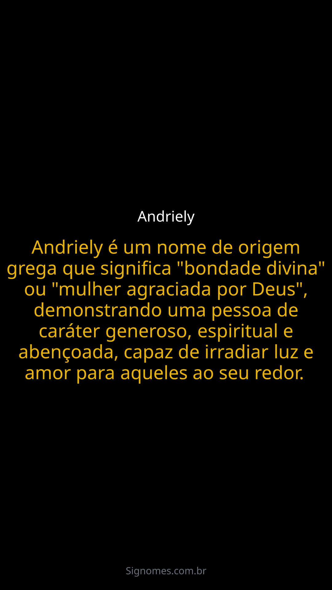 Andriely é um nome de origem grega que significa "bondade divina" ou "mulher agraciada por Deus", demonstrando uma pessoa de caráter generoso, espiritual e abençoada, capaz de irradiar luz e amor para aqueles ao seu redor.