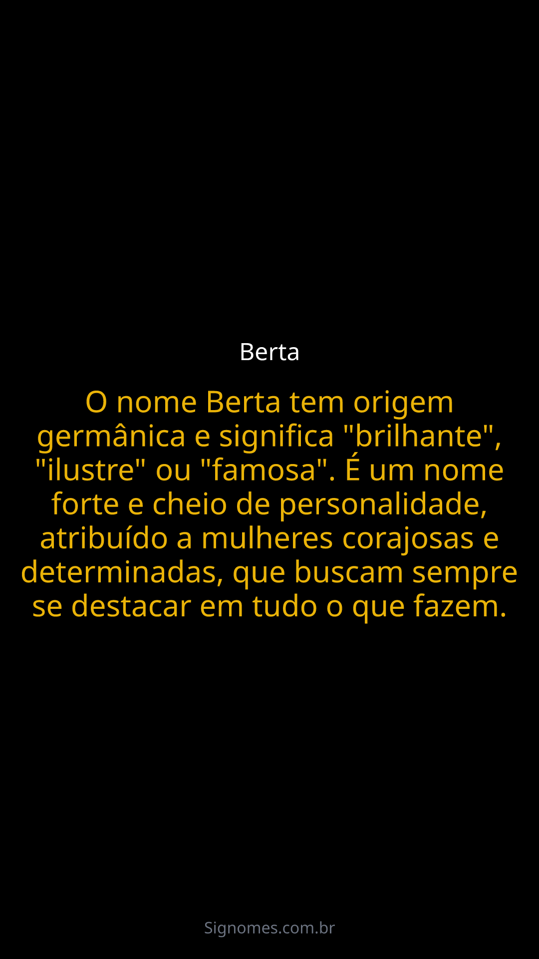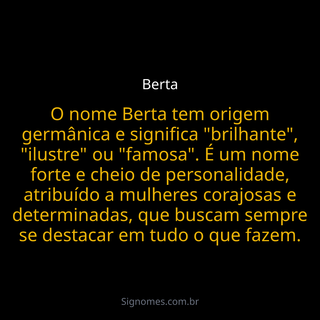 O nome Berta tem origem germânica e significa "brilhante", "ilustre" ou "famosa". É um nome forte e cheio de personalidade, atribuído a mulheres corajosas e determinadas, que buscam sempre se destacar em tudo o que fazem.
