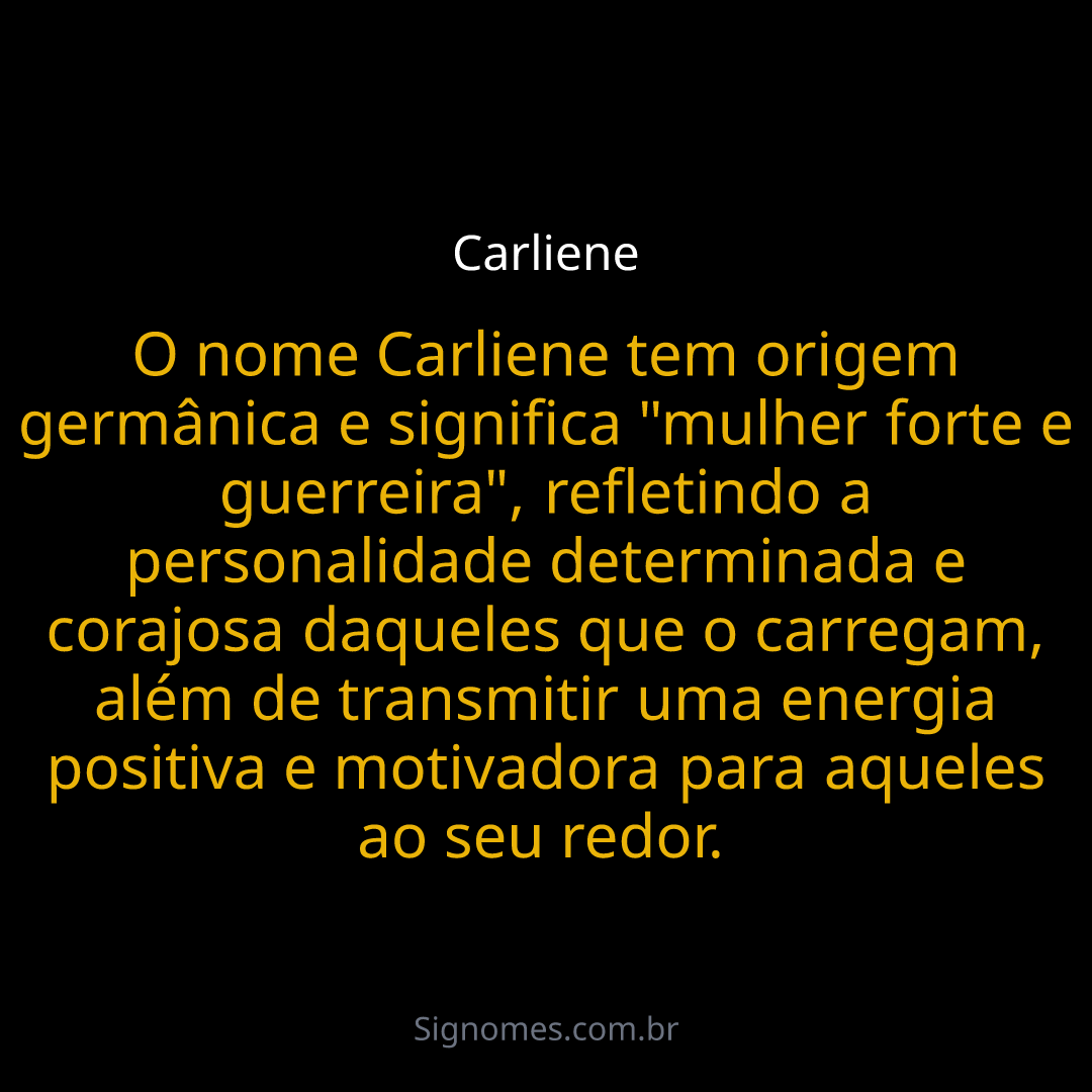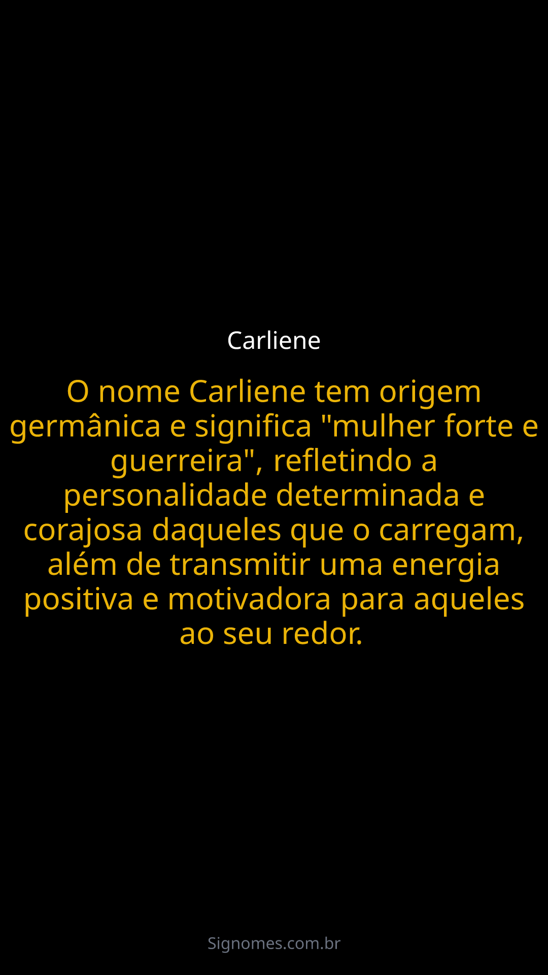 O nome Carliene tem origem germânica e significa "mulher forte e guerreira", refletindo a personalidade determinada e corajosa daqueles que o carregam, além de transmitir uma energia positiva e motivadora para aqueles ao seu redor.