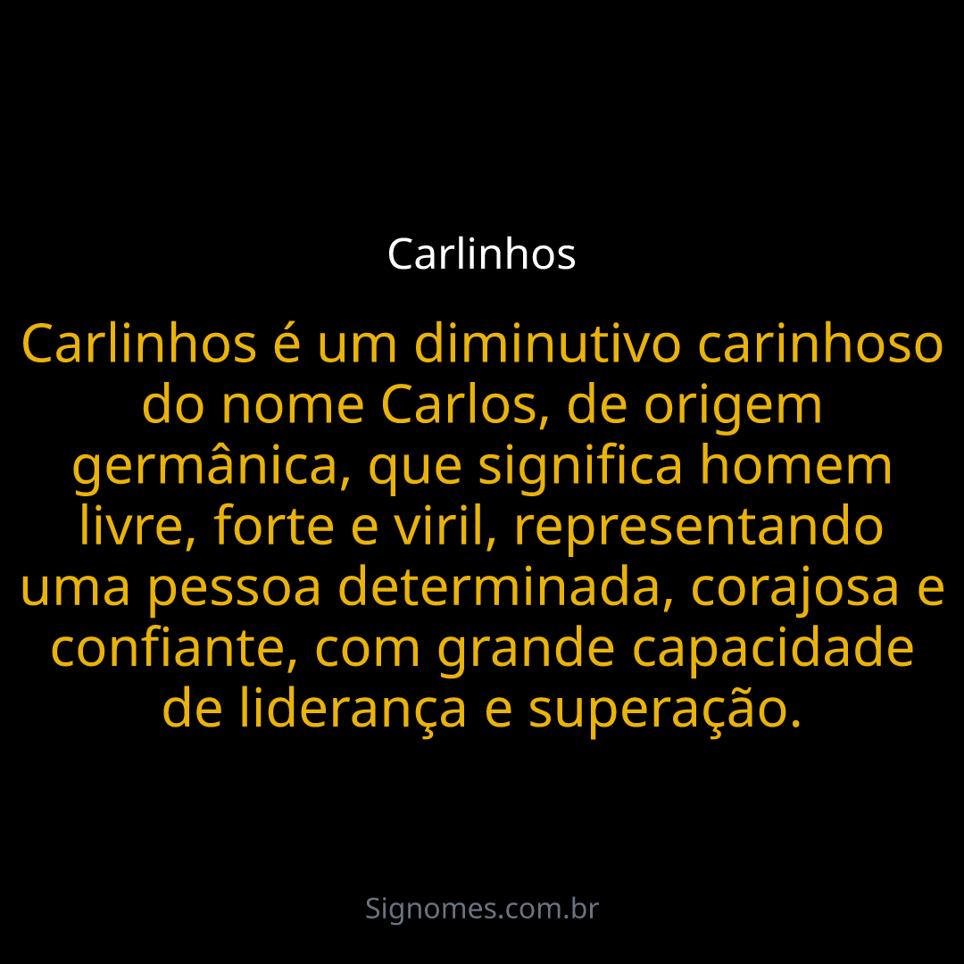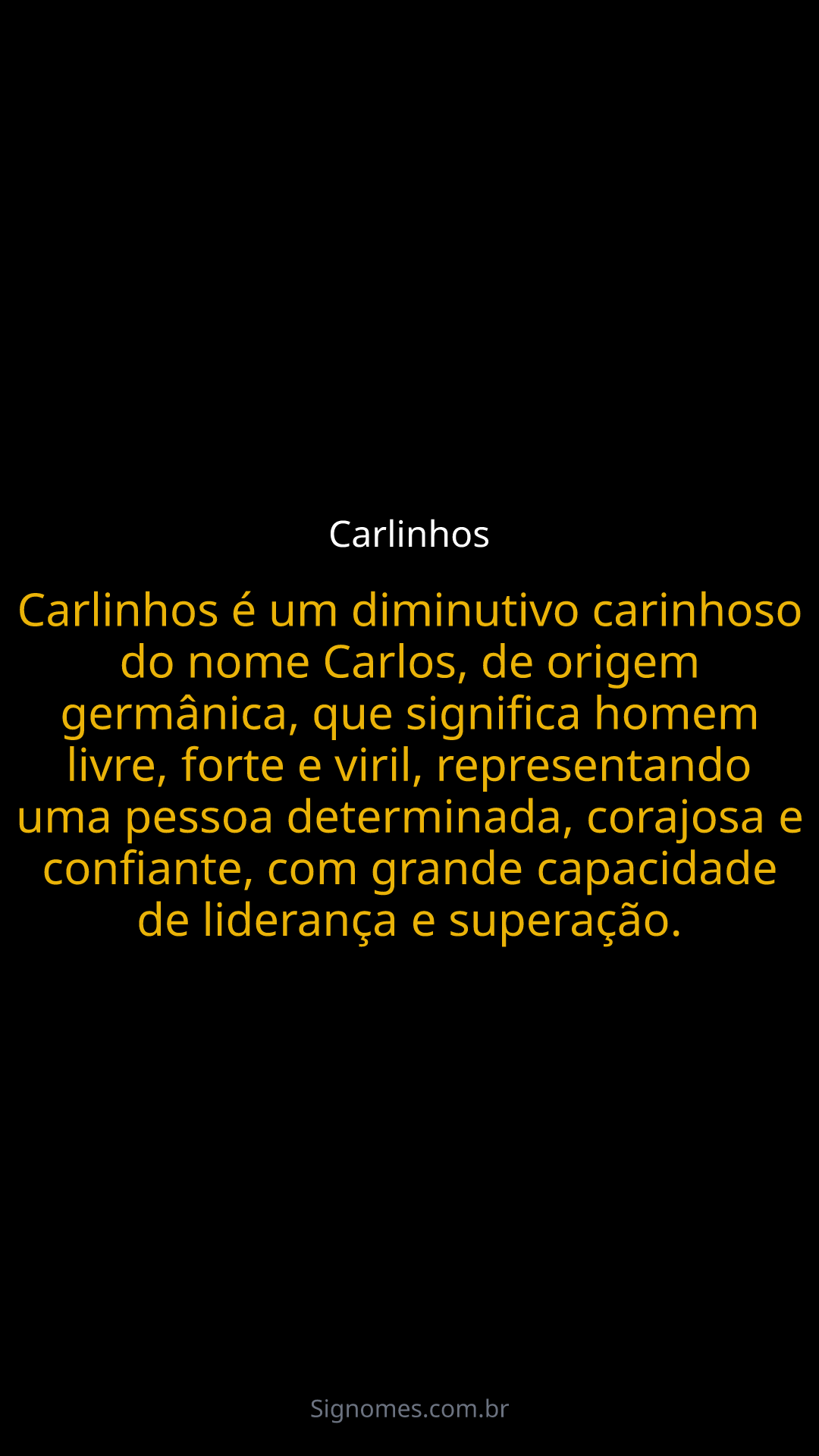 Carlinhos é um diminutivo carinhoso do nome Carlos, de origem germânica, que significa homem livre, forte e viril, representando uma pessoa determinada, corajosa e confiante, com grande capacidade de liderança e superação.