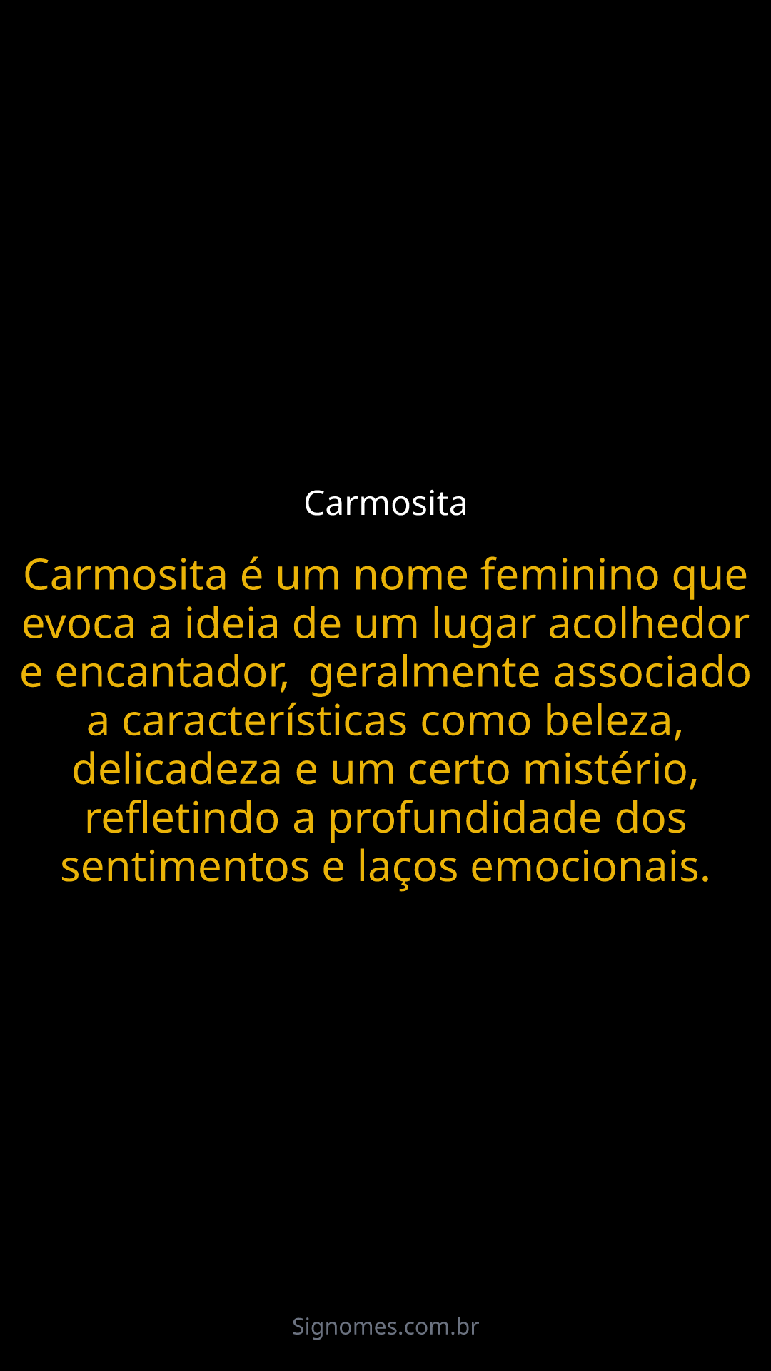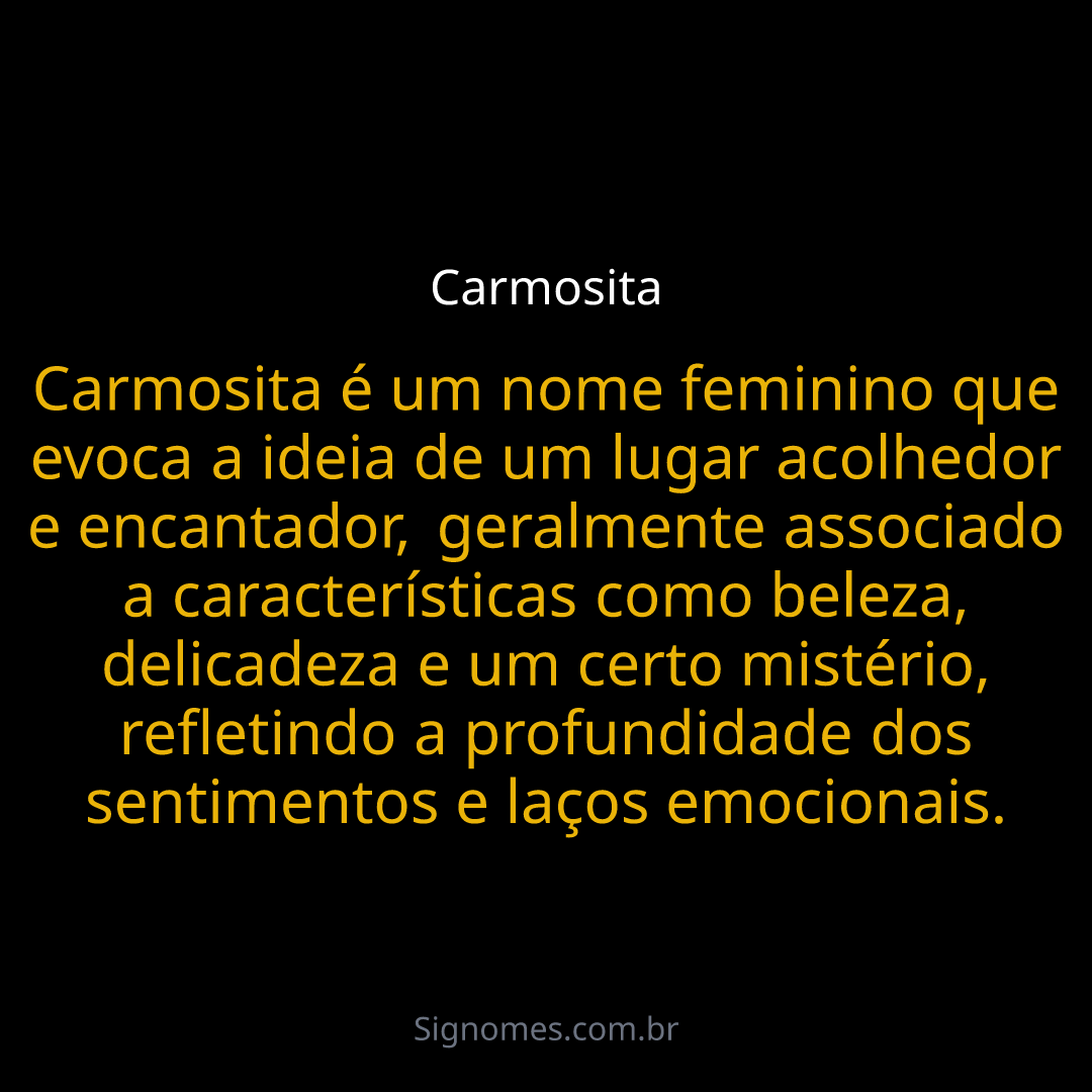 Carmosita é um nome feminino que evoca a ideia de um lugar acolhedor e encantador, geralmente associado a características como beleza, delicadeza e um certo mistério, refletindo a profundidade dos sentimentos e laços emocionais.