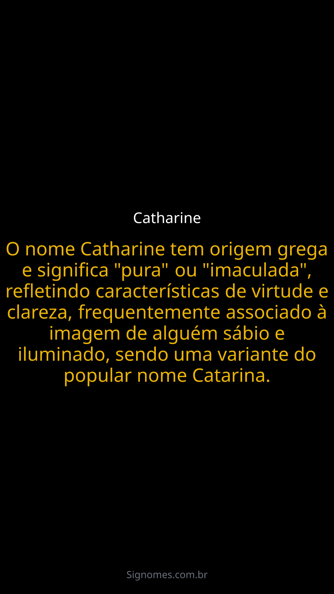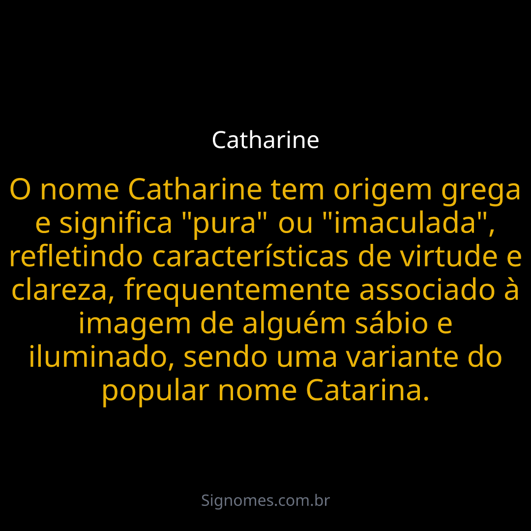 O nome Catharine tem origem grega e significa "pura" ou "imaculada", refletindo características de virtude e clareza, frequentemente associado à imagem de alguém sábio e iluminado, sendo uma variante do popular nome Catarina.