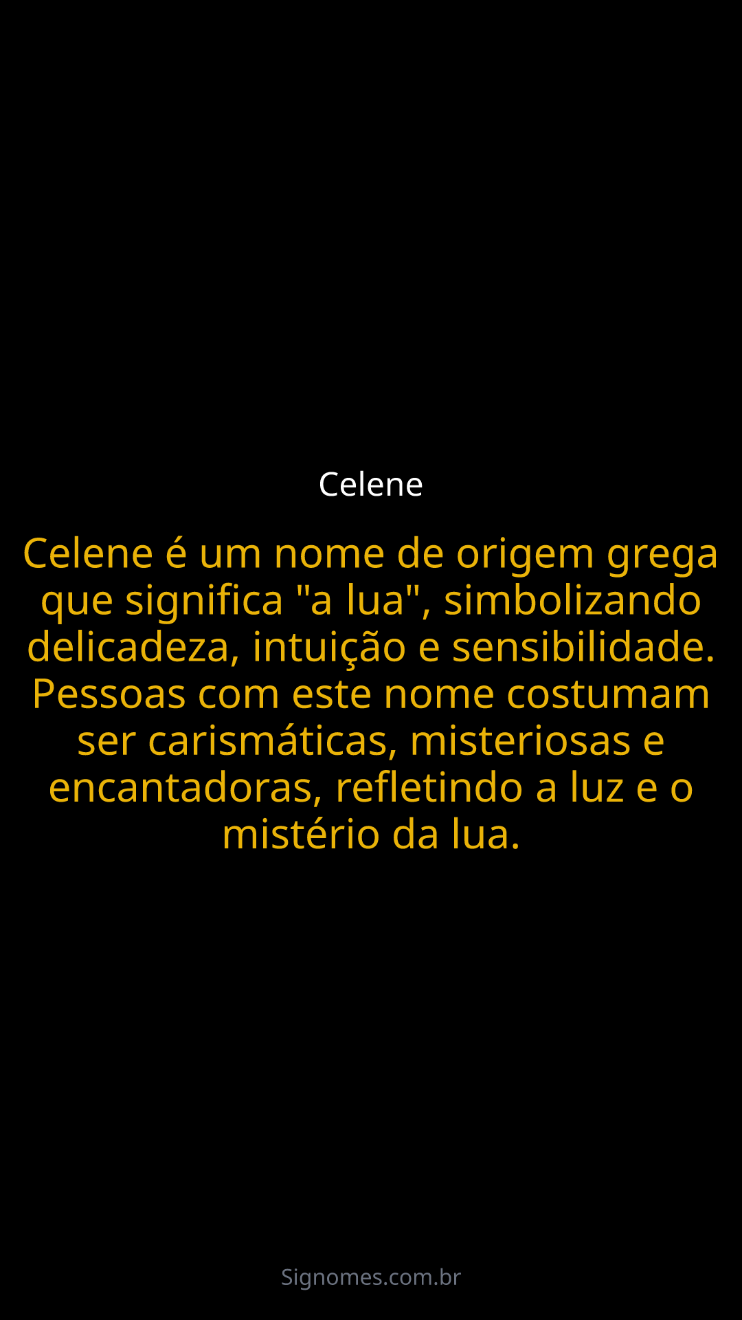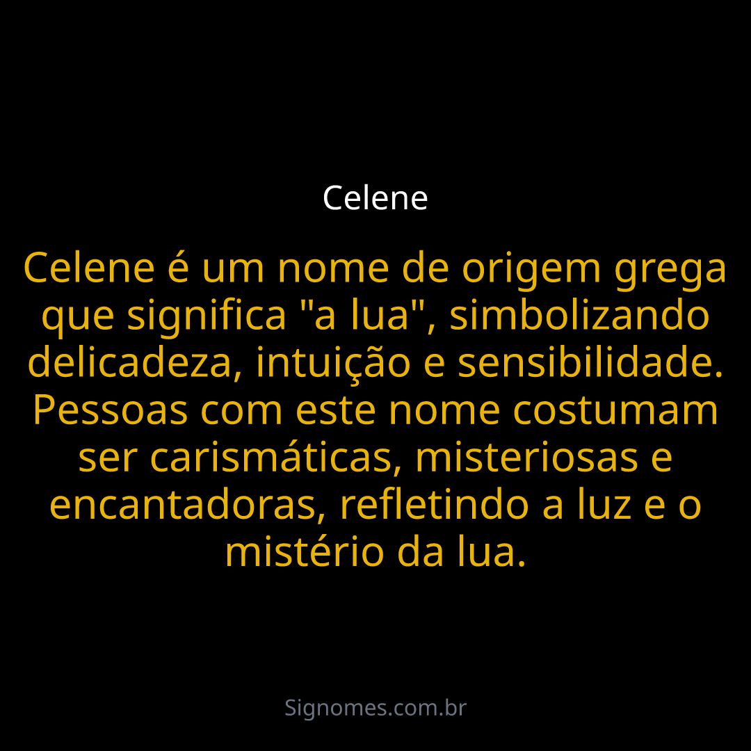Celene é um nome de origem grega que significa "a lua", simbolizando delicadeza, intuição e sensibilidade. Pessoas com este nome costumam ser carismáticas, misteriosas e encantadoras, refletindo a luz e o mistério da lua.