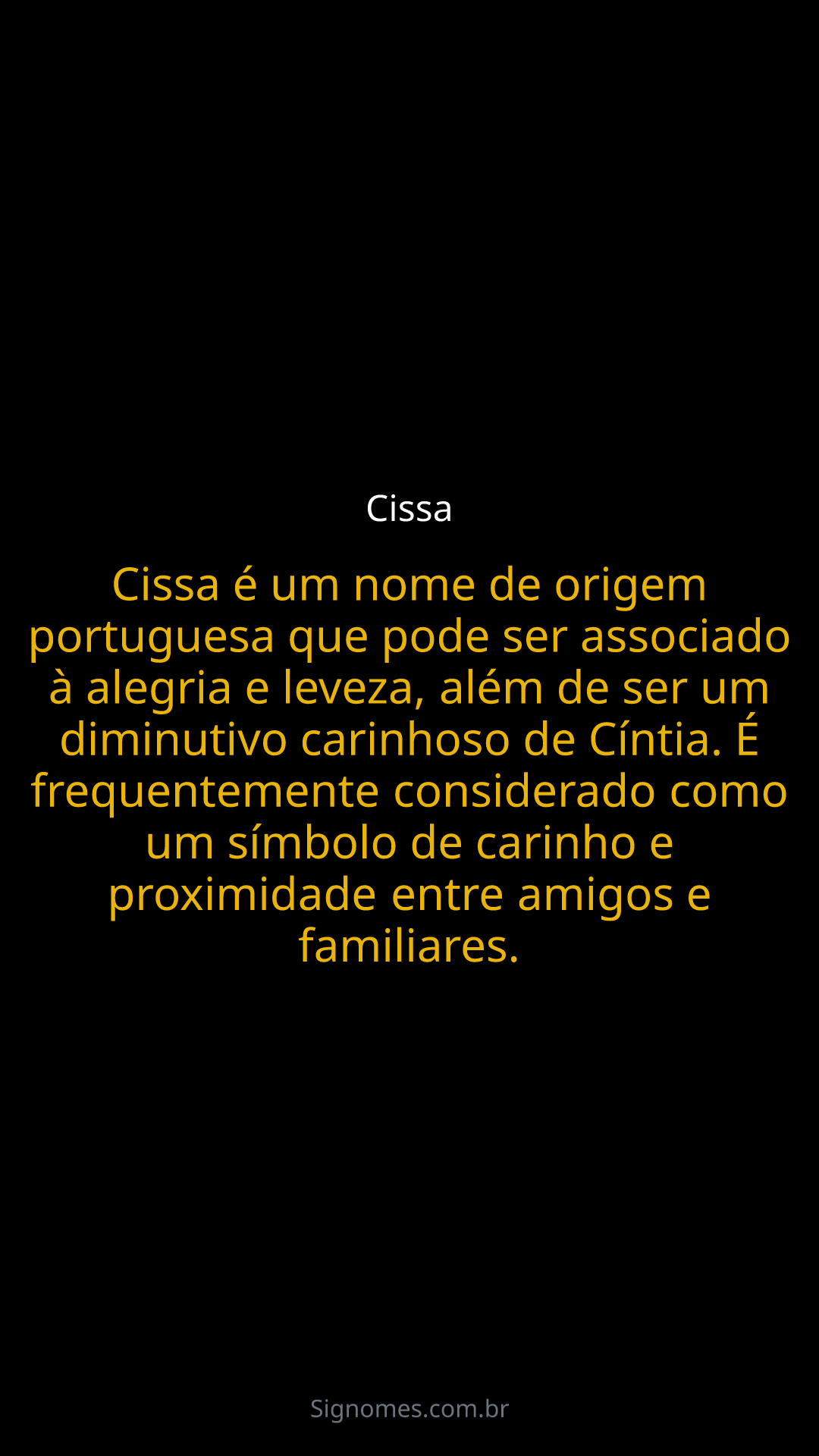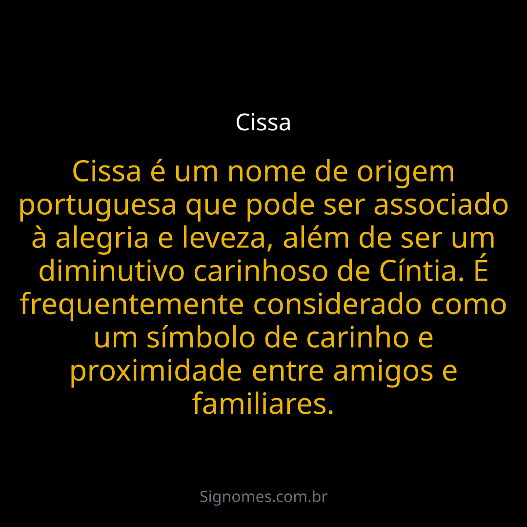 Cissa é um nome de origem portuguesa que pode ser associado à alegria e leveza, além de ser um diminutivo carinhoso de Cíntia. É frequentemente considerado como um símbolo de carinho e proximidade entre amigos e familiares.