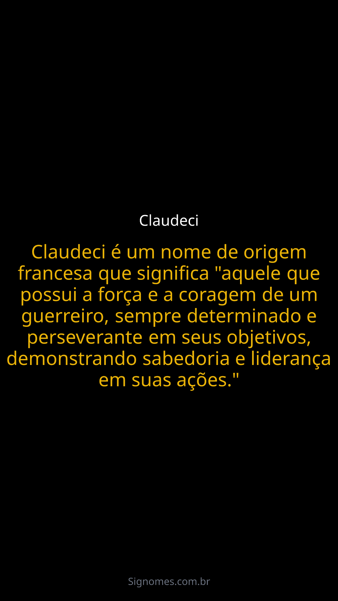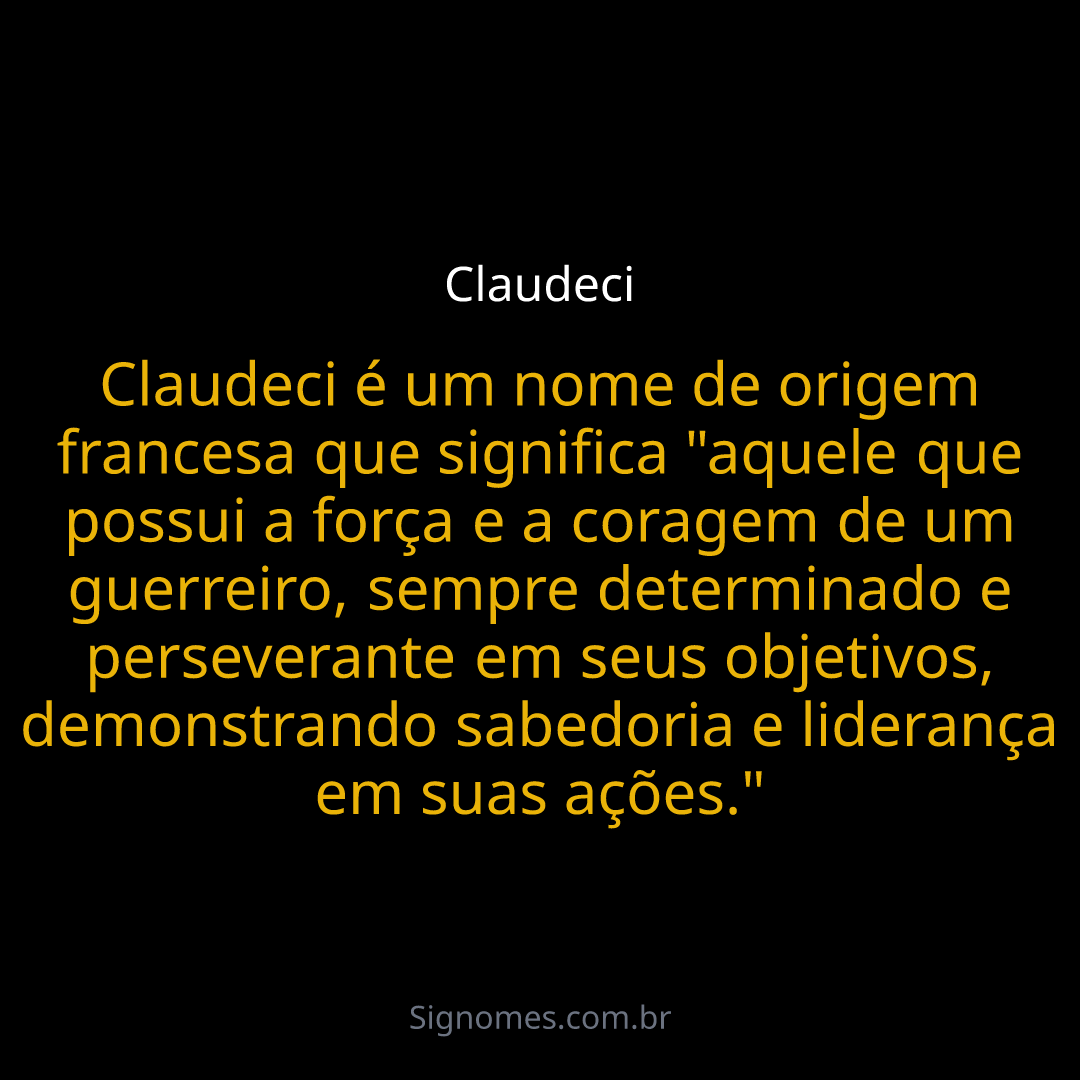 Claudeci é um nome de origem francesa que significa "aquele que possui a força e a coragem de um guerreiro, sempre determinado e perseverante em seus objetivos, demonstrando sabedoria e liderança em suas ações."