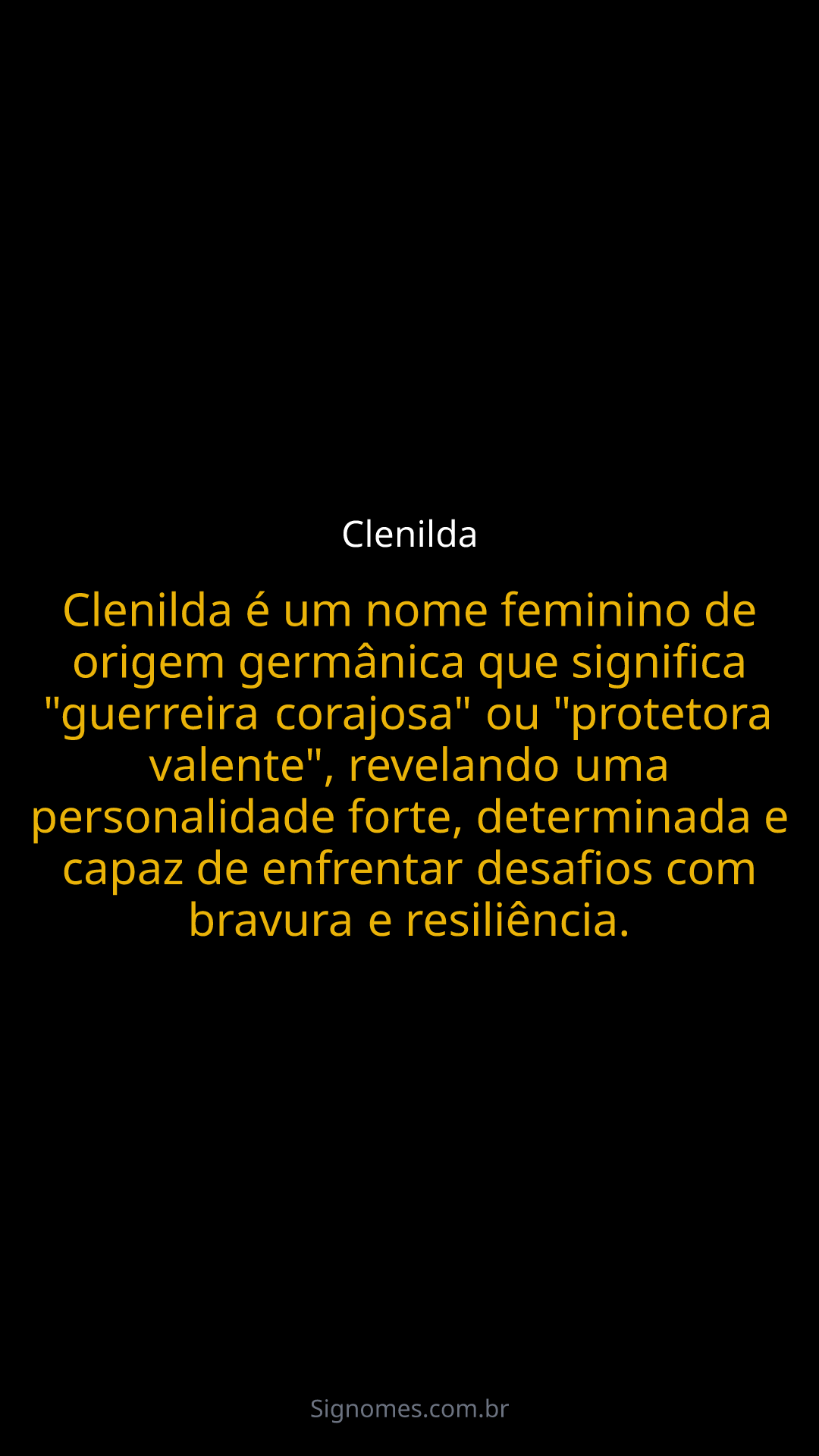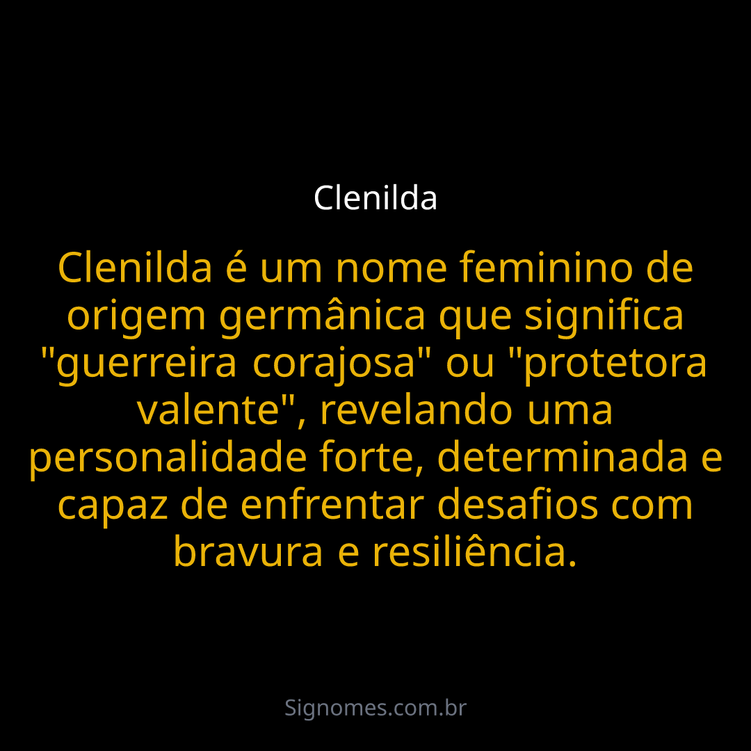 Clenilda é um nome feminino de origem germânica que significa "guerreira corajosa" ou "protetora valente", revelando uma personalidade forte, determinada e capaz de enfrentar desafios com bravura e resiliência.