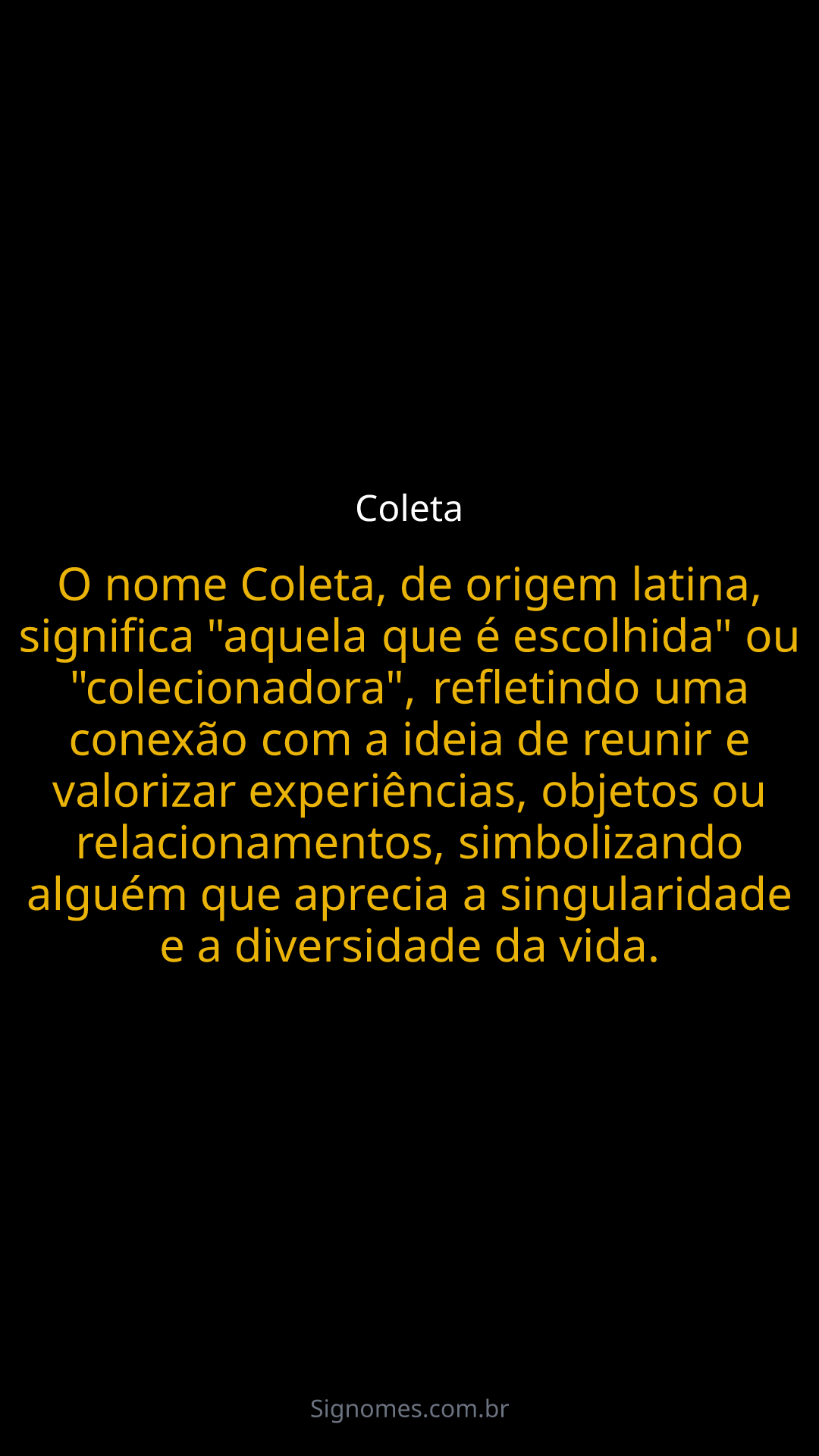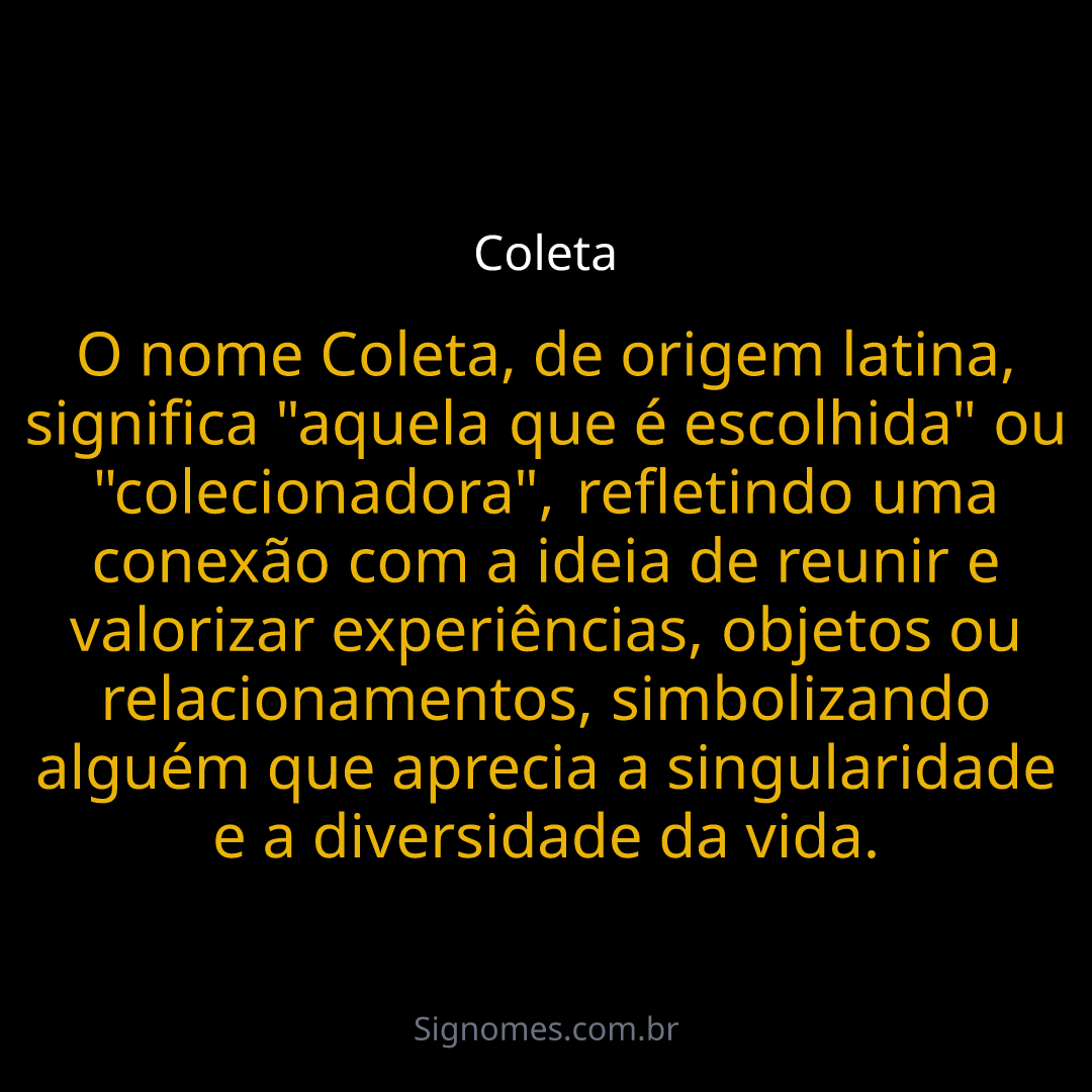 O nome Coleta, de origem latina, significa "aquela que é escolhida" ou "colecionadora", refletindo uma conexão com a ideia de reunir e valorizar experiências, objetos ou relacionamentos, simbolizando alguém que aprecia a singularidade e a diversidade da vida.
