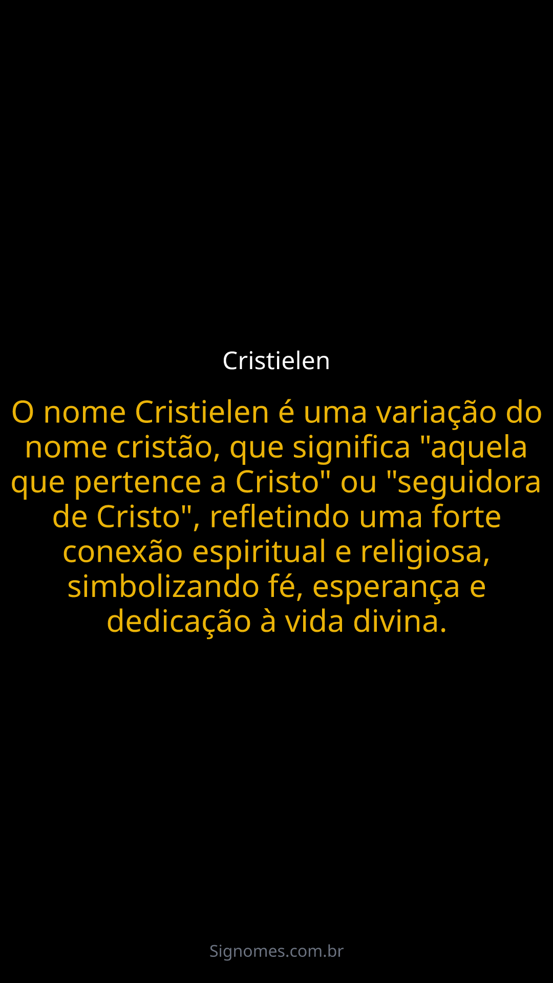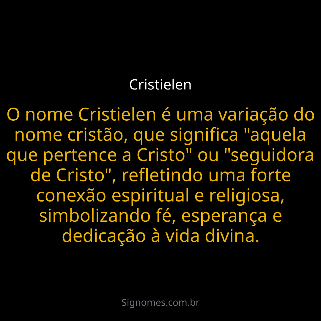 O nome Cristielen é uma variação do nome cristão, que significa "aquela que pertence a Cristo" ou "seguidora de Cristo", refletindo uma forte conexão espiritual e religiosa, simbolizando fé, esperança e dedicação à vida divina.
