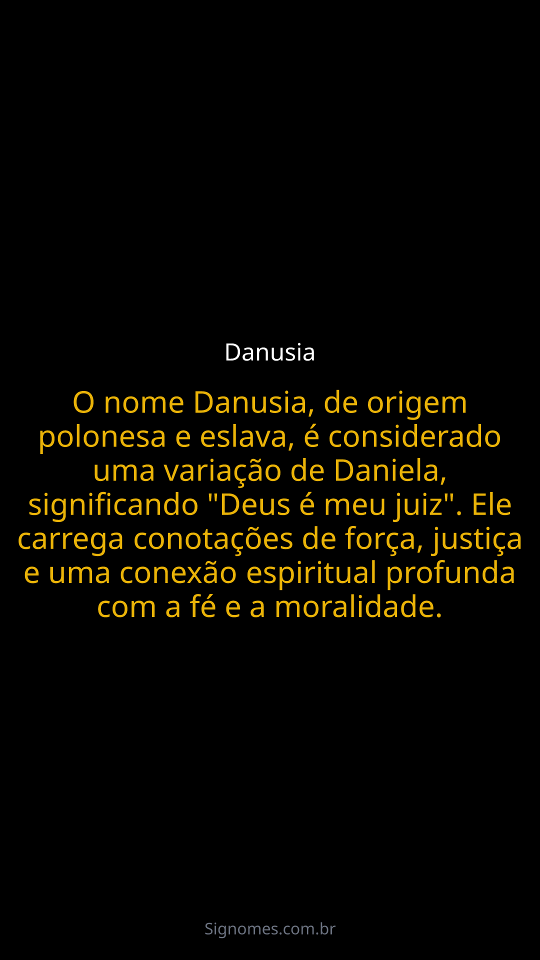 O nome Danusia, de origem polonesa e eslava, é considerado uma variação de Daniela, significando "Deus é meu juiz". Ele carrega conotações de força, justiça e uma conexão espiritual profunda com a fé e a moralidade.
