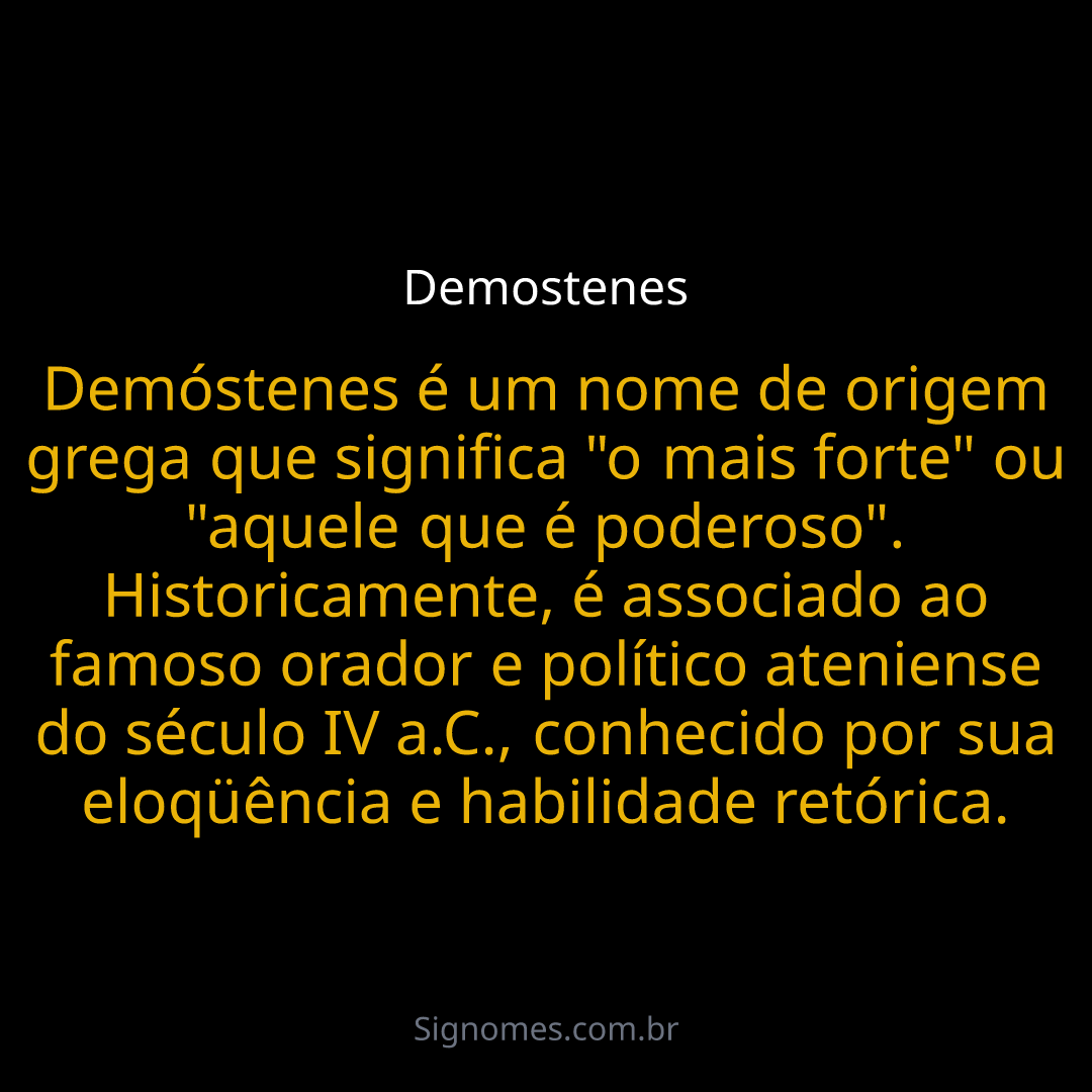 Demóstenes é um nome de origem grega que significa "o mais forte" ou "aquele que é poderoso". Historicamente, é associado ao famoso orador e político ateniense do século IV a.C., conhecido por sua eloqüência e habilidade retórica.