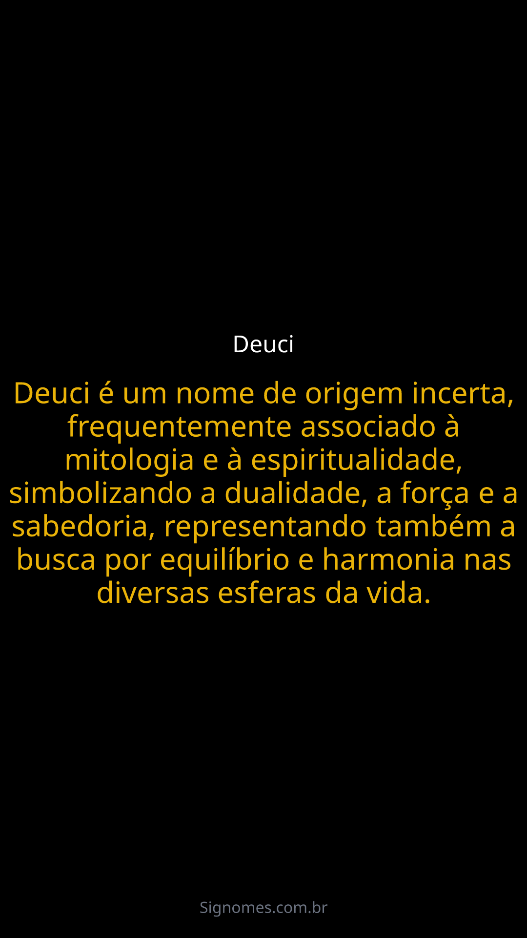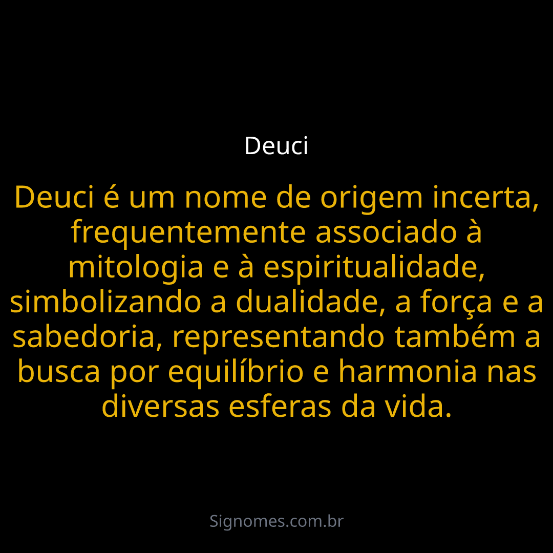 Deuci é um nome de origem incerta, frequentemente associado à mitologia e à espiritualidade, simbolizando a dualidade, a força e a sabedoria, representando também a busca por equilíbrio e harmonia nas diversas esferas da vida.