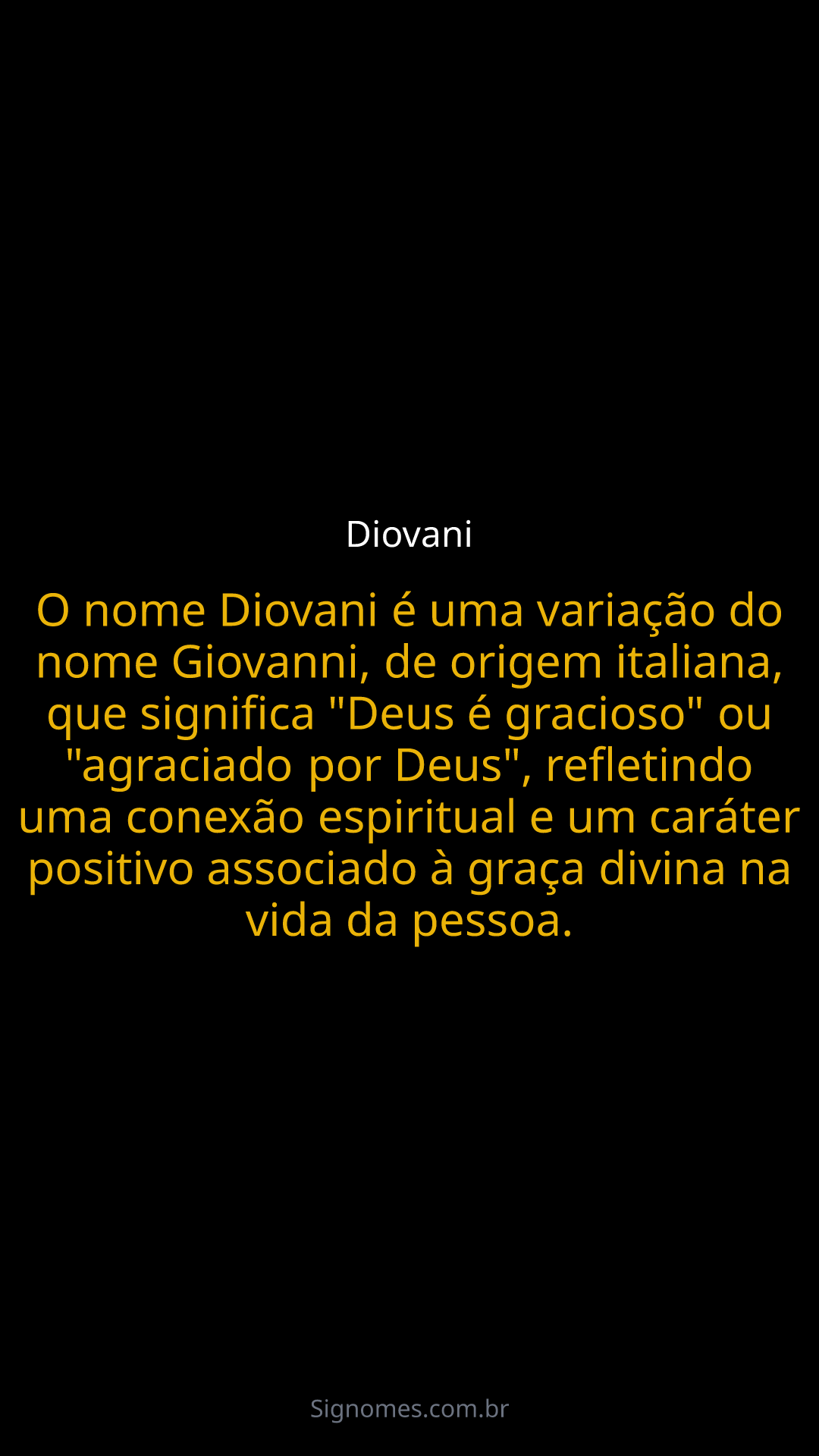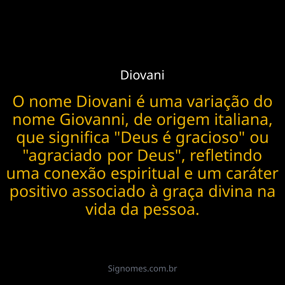 O nome Diovani é uma variação do nome Giovanni, de origem italiana, que significa "Deus é gracioso" ou "agraciado por Deus", refletindo uma conexão espiritual e um caráter positivo associado à graça divina na vida da pessoa.
