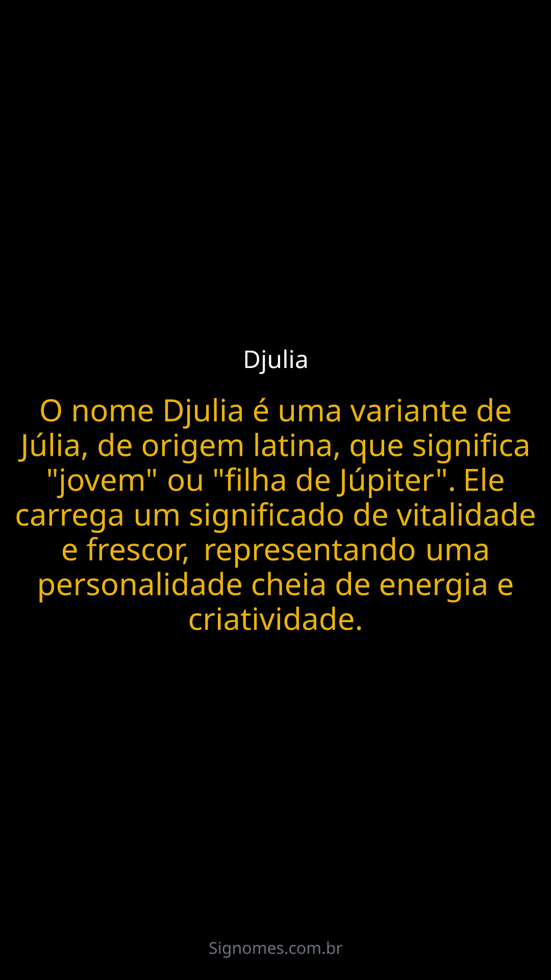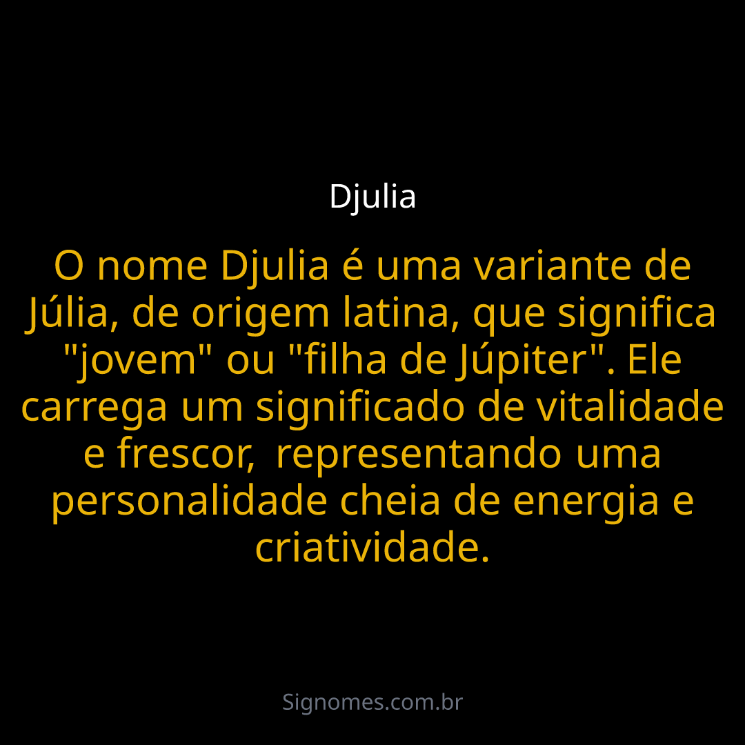 O nome Djulia é uma variante de Júlia, de origem latina, que significa "jovem" ou "filha de Júpiter". Ele carrega um significado de vitalidade e frescor, representando uma personalidade cheia de energia e criatividade.