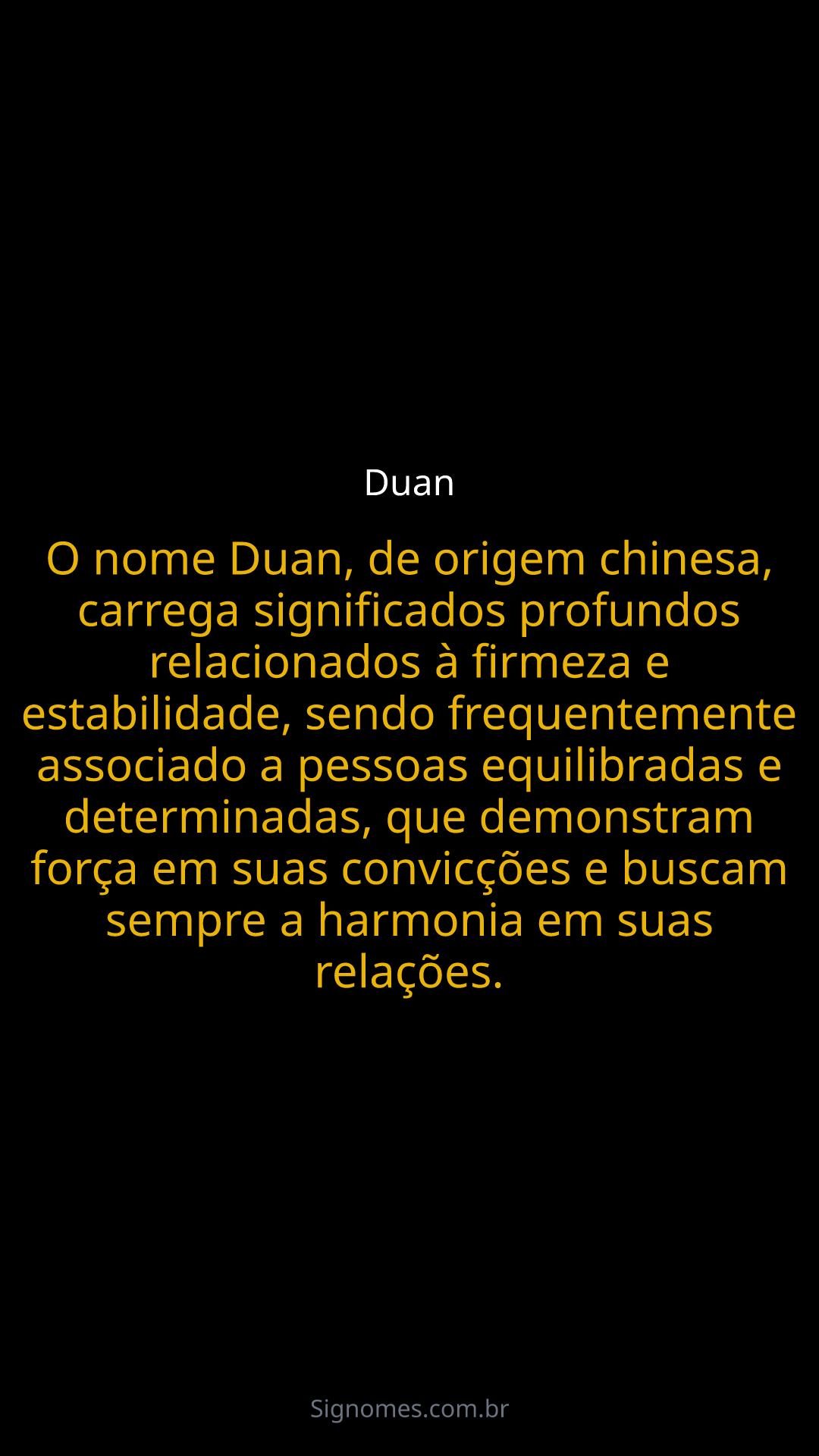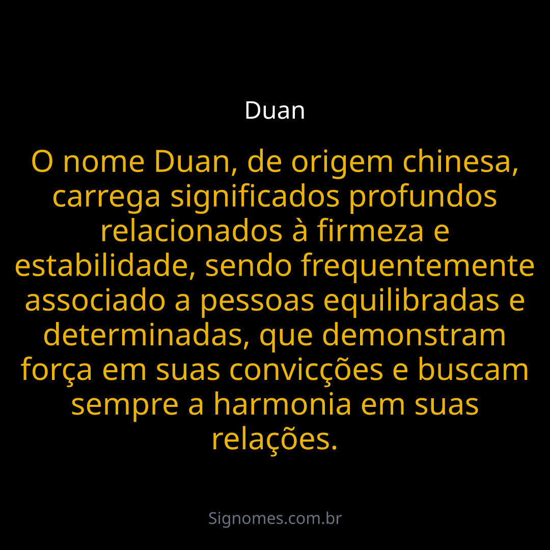 O nome Duan, de origem chinesa, carrega significados profundos relacionados à firmeza e estabilidade, sendo frequentemente associado a pessoas equilibradas e determinadas, que demonstram força em suas convicções e buscam sempre a harmonia em suas relações.