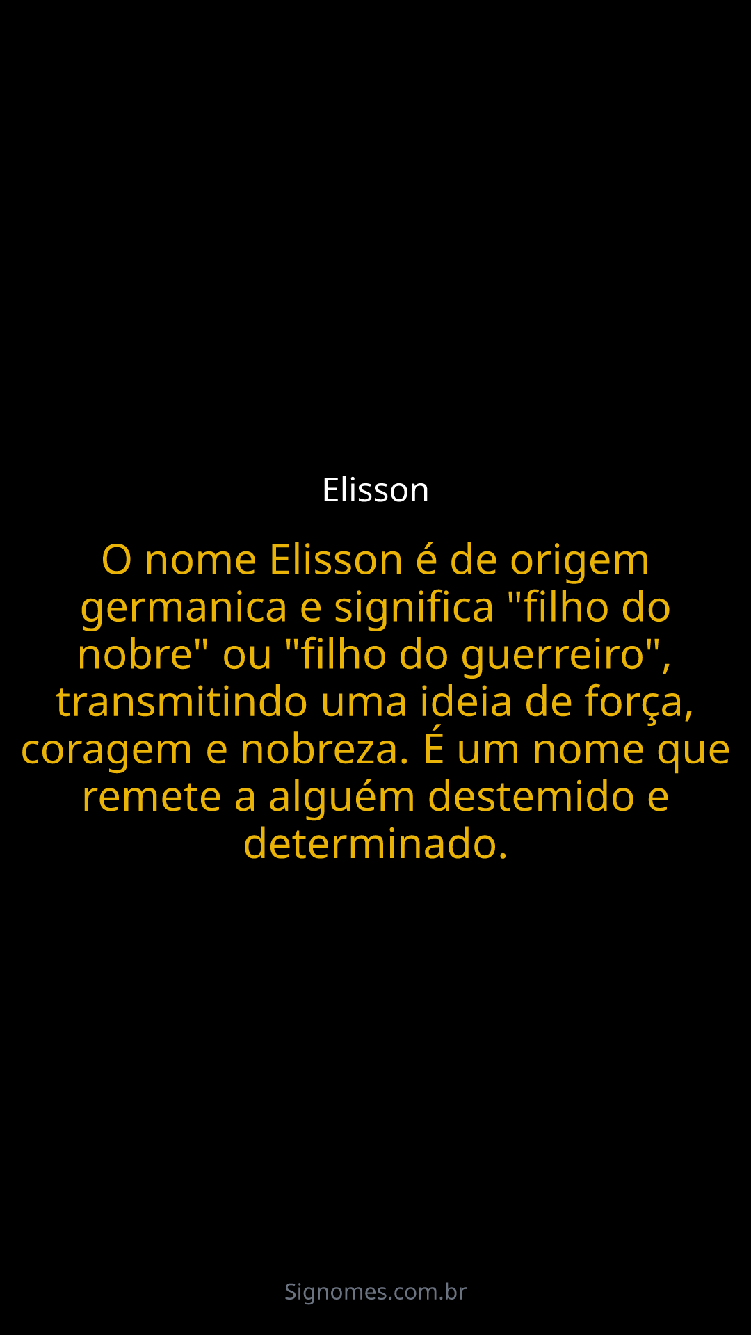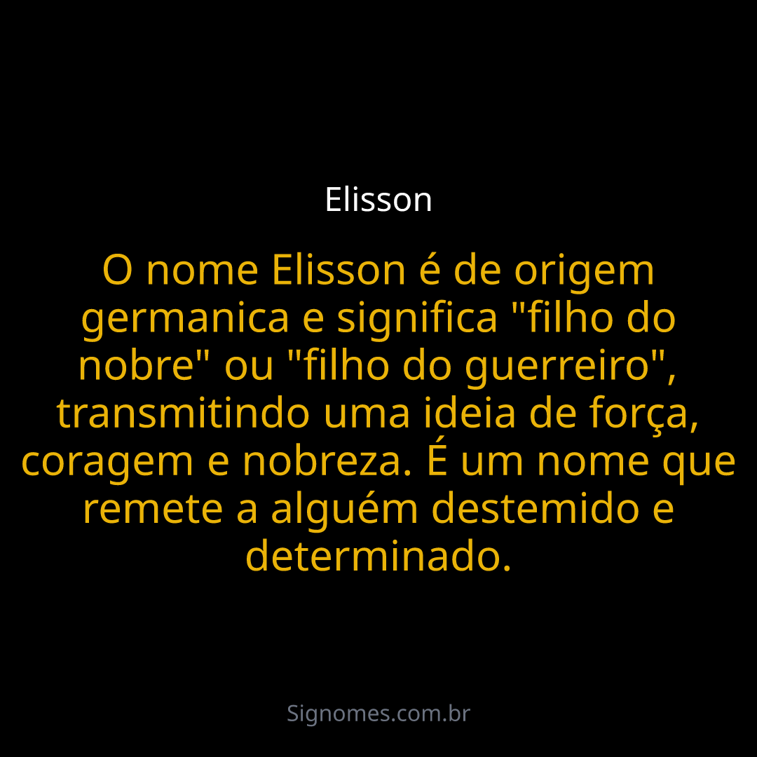 O nome Elisson é de origem germanica e significa "filho do nobre" ou "filho do guerreiro", transmitindo uma ideia de força, coragem e nobreza. É um nome que remete a alguém destemido e determinado.