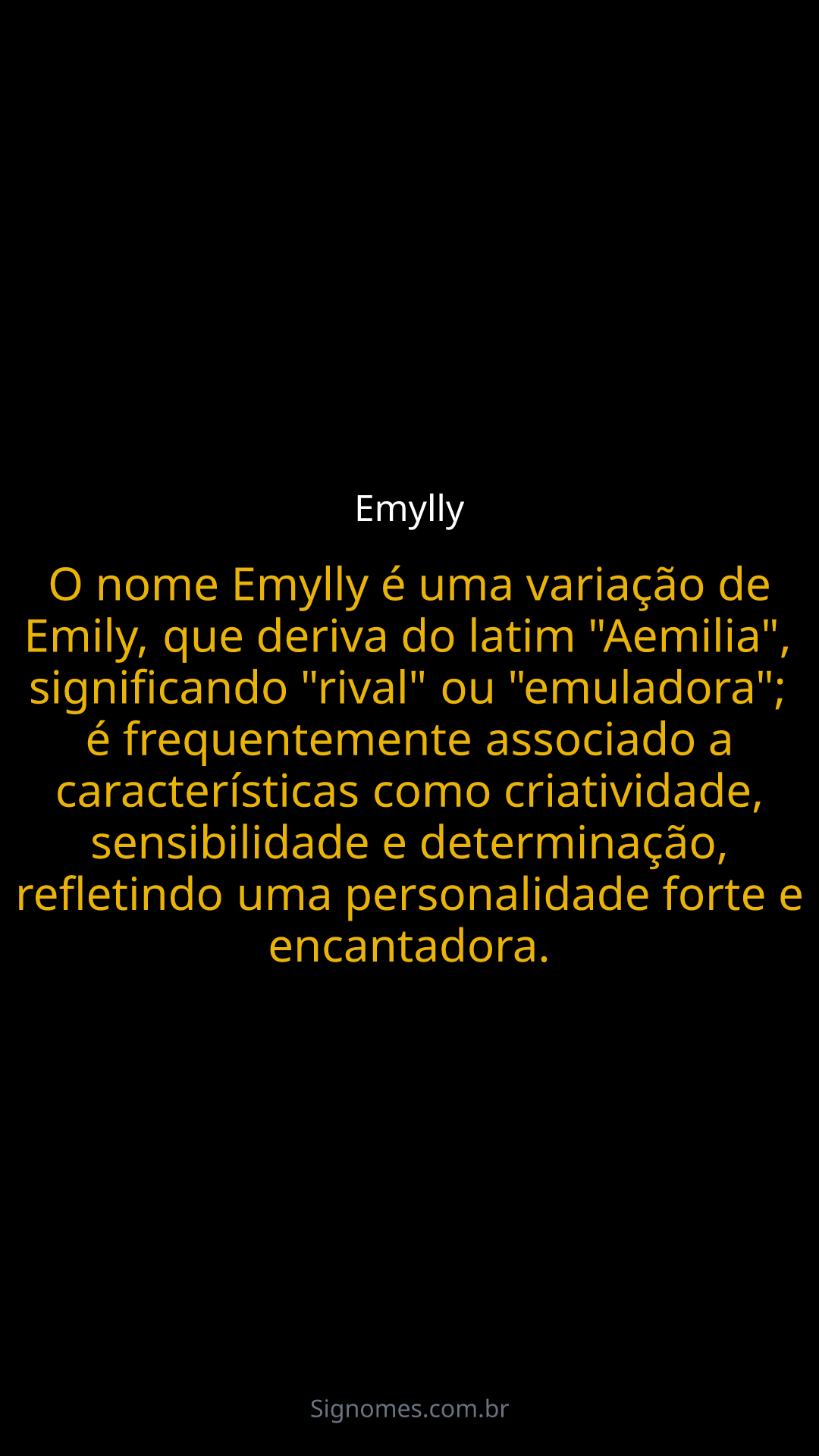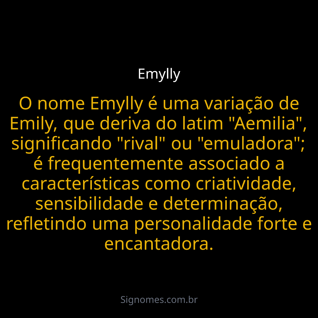 O nome Emylly é uma variação de Emily, que deriva do latim "Aemilia", significando "rival" ou "emuladora"; é frequentemente associado a características como criatividade, sensibilidade e determinação, refletindo uma personalidade forte e encantadora.