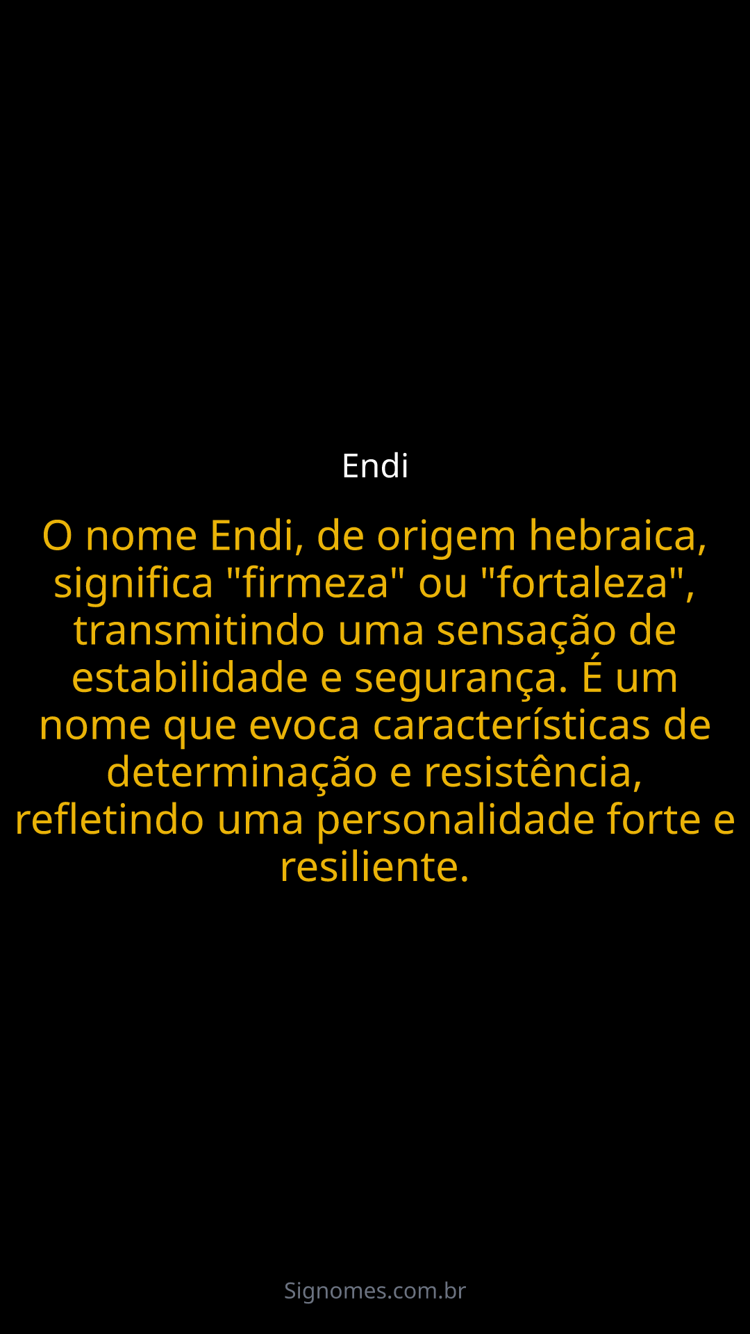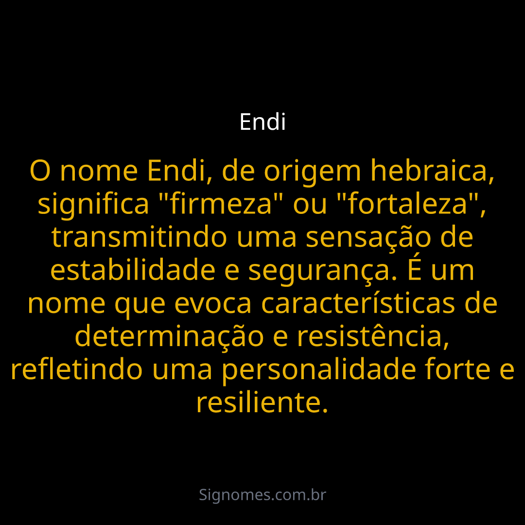 O nome Endi, de origem hebraica, significa "firmeza" ou "fortaleza", transmitindo uma sensação de estabilidade e segurança. É um nome que evoca características de determinação e resistência, refletindo uma personalidade forte e resiliente.