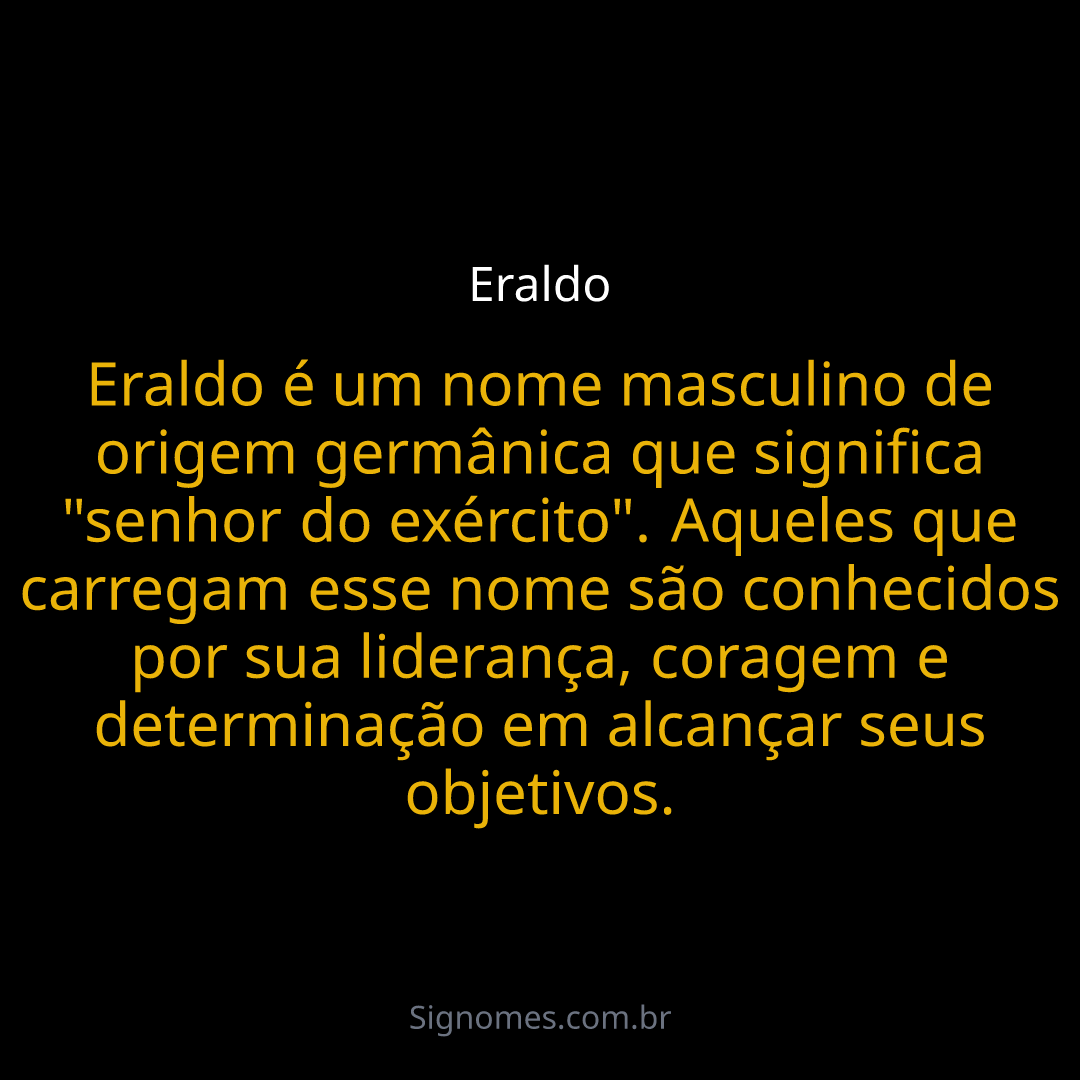 Eraldo é um nome masculino de origem germânica que significa "senhor do exército". Aqueles que carregam esse nome são conhecidos por sua liderança, coragem e determinação em alcançar seus objetivos.