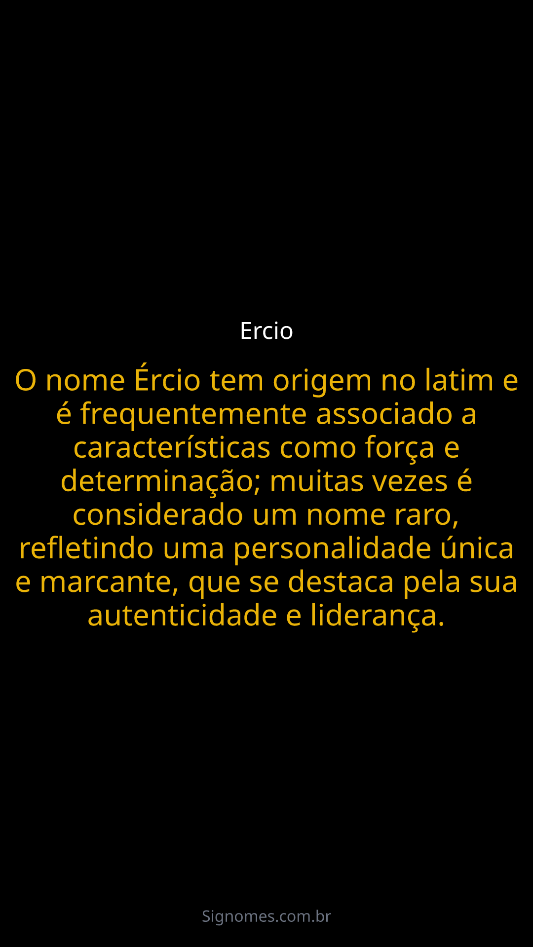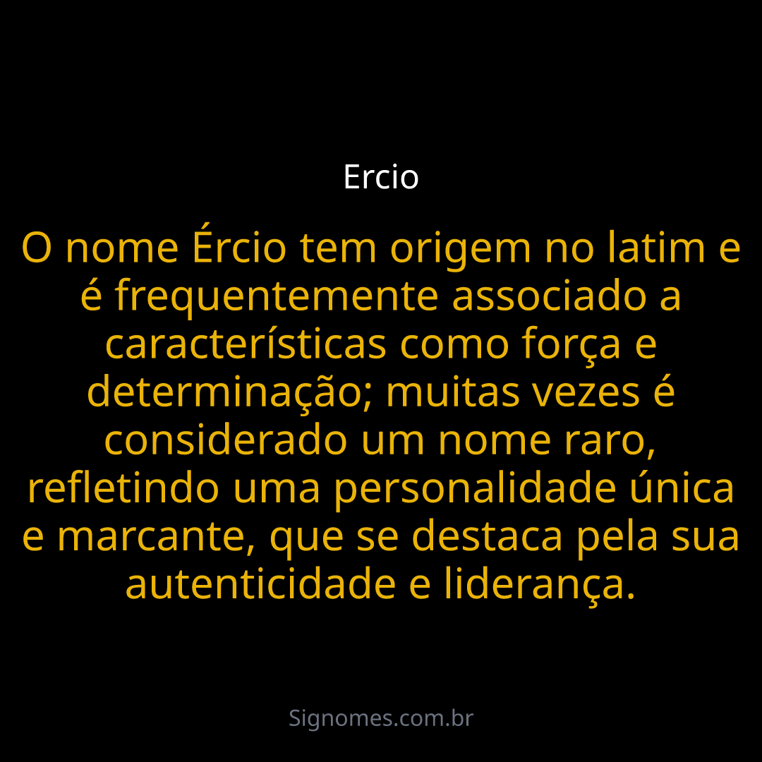 O nome Ércio tem origem no latim e é frequentemente associado a características como força e determinação; muitas vezes é considerado um nome raro, refletindo uma personalidade única e marcante, que se destaca pela sua autenticidade e liderança.