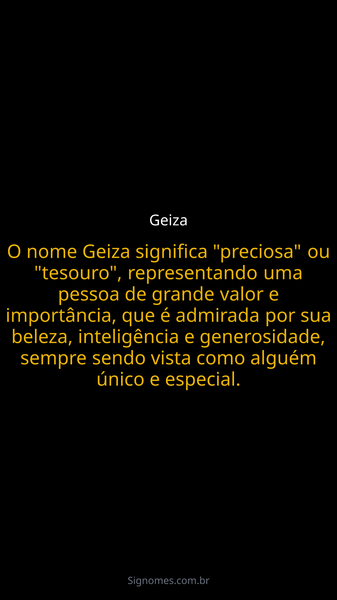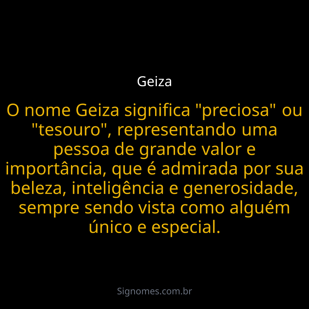 O nome Geiza significa "preciosa" ou "tesouro", representando uma pessoa de grande valor e importância, que é admirada por sua beleza, inteligência e generosidade, sempre sendo vista como alguém único e especial.