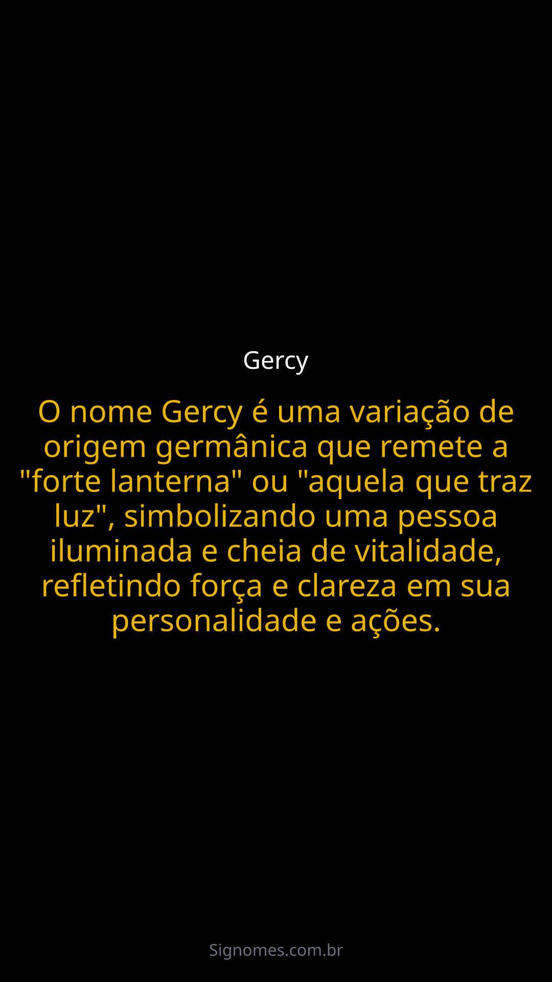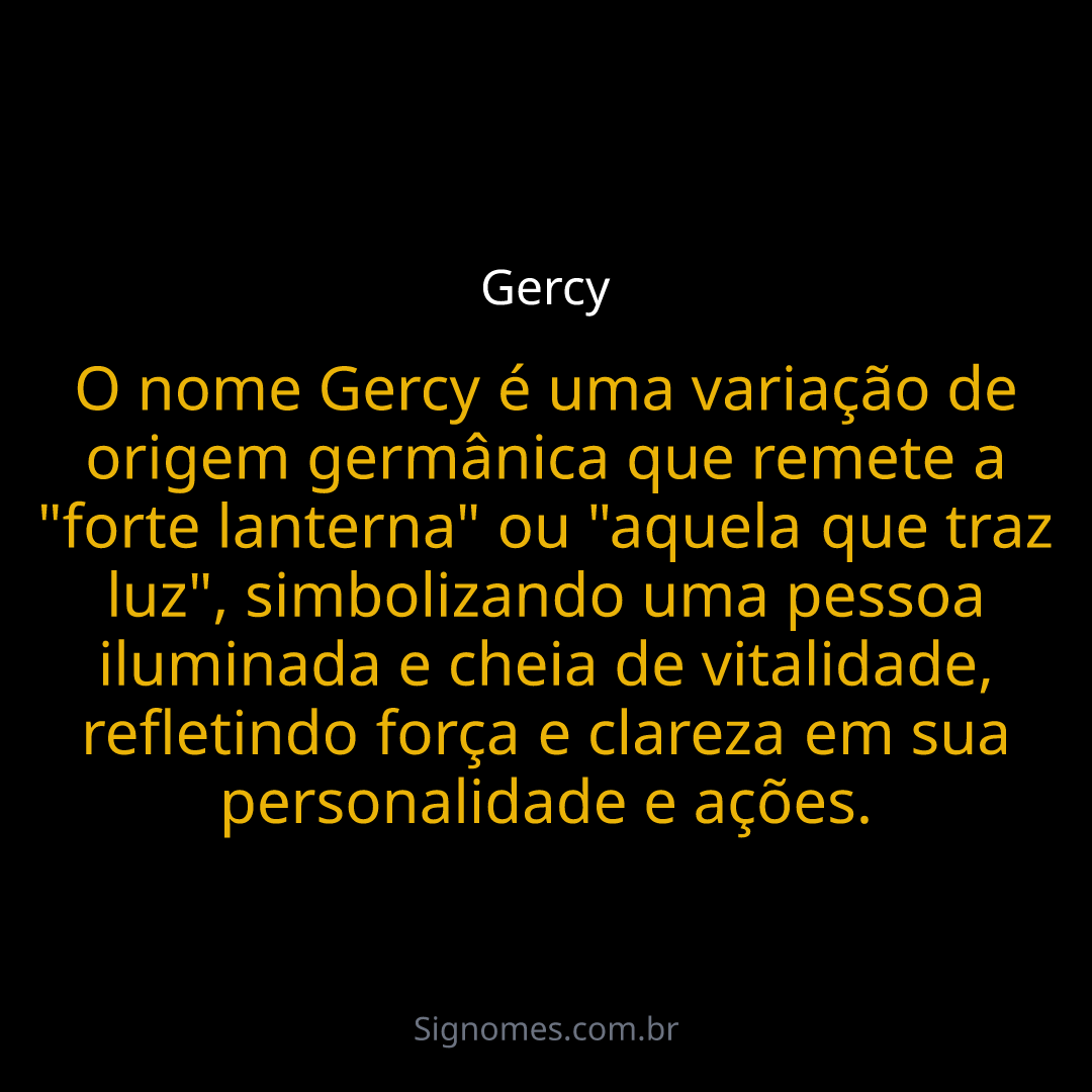 O nome Gercy é uma variação de origem germânica que remete a "forte lanterna" ou "aquela que traz luz", simbolizando uma pessoa iluminada e cheia de vitalidade, refletindo força e clareza em sua personalidade e ações.
