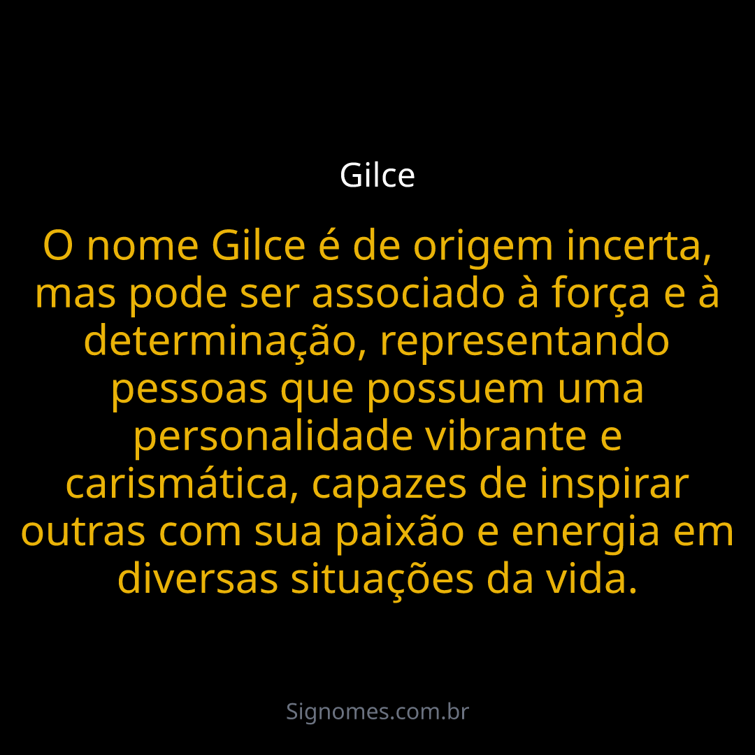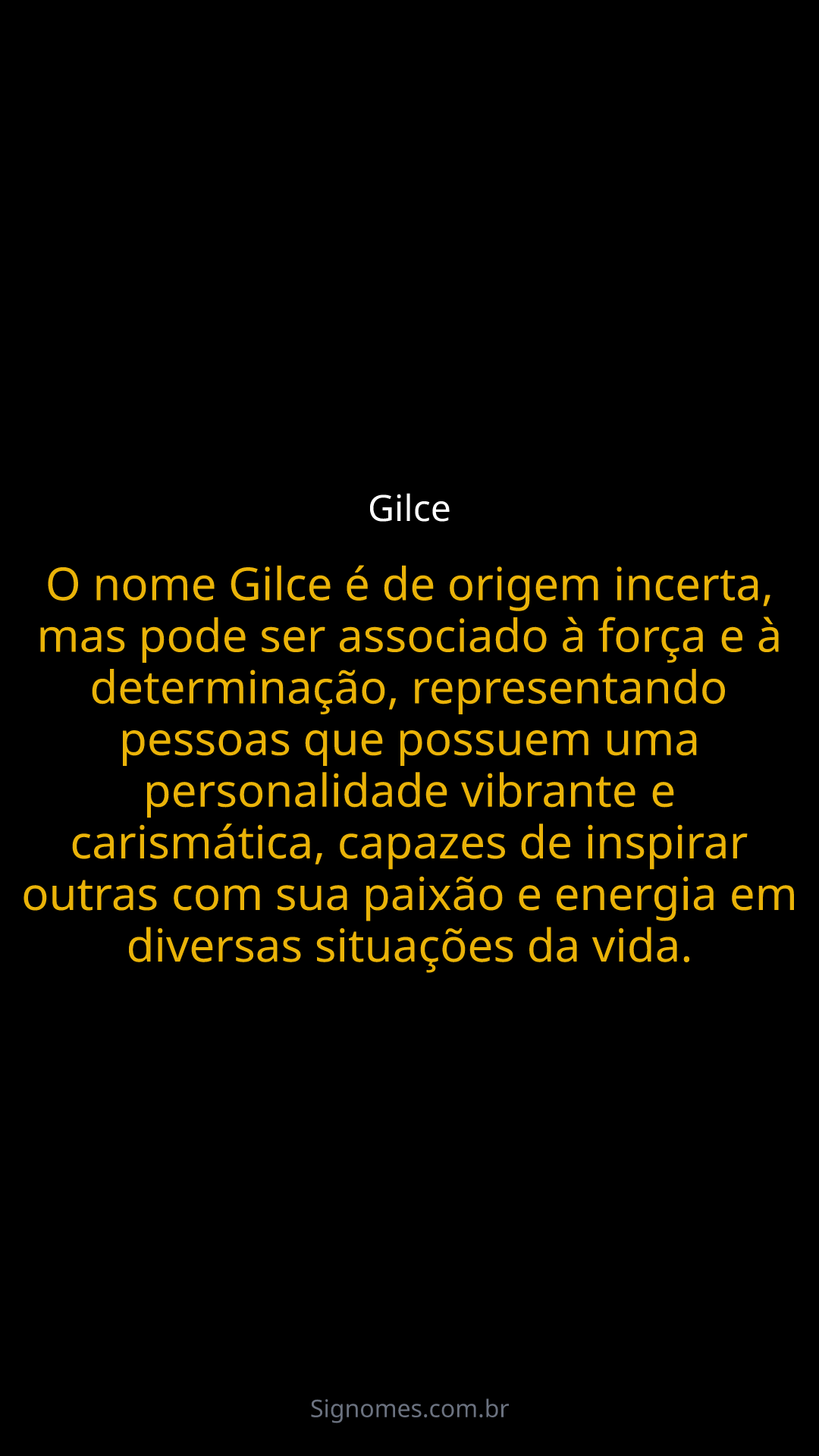 O nome Gilce é de origem incerta, mas pode ser associado à força e à determinação, representando pessoas que possuem uma personalidade vibrante e carismática, capazes de inspirar outras com sua paixão e energia em diversas situações da vida.