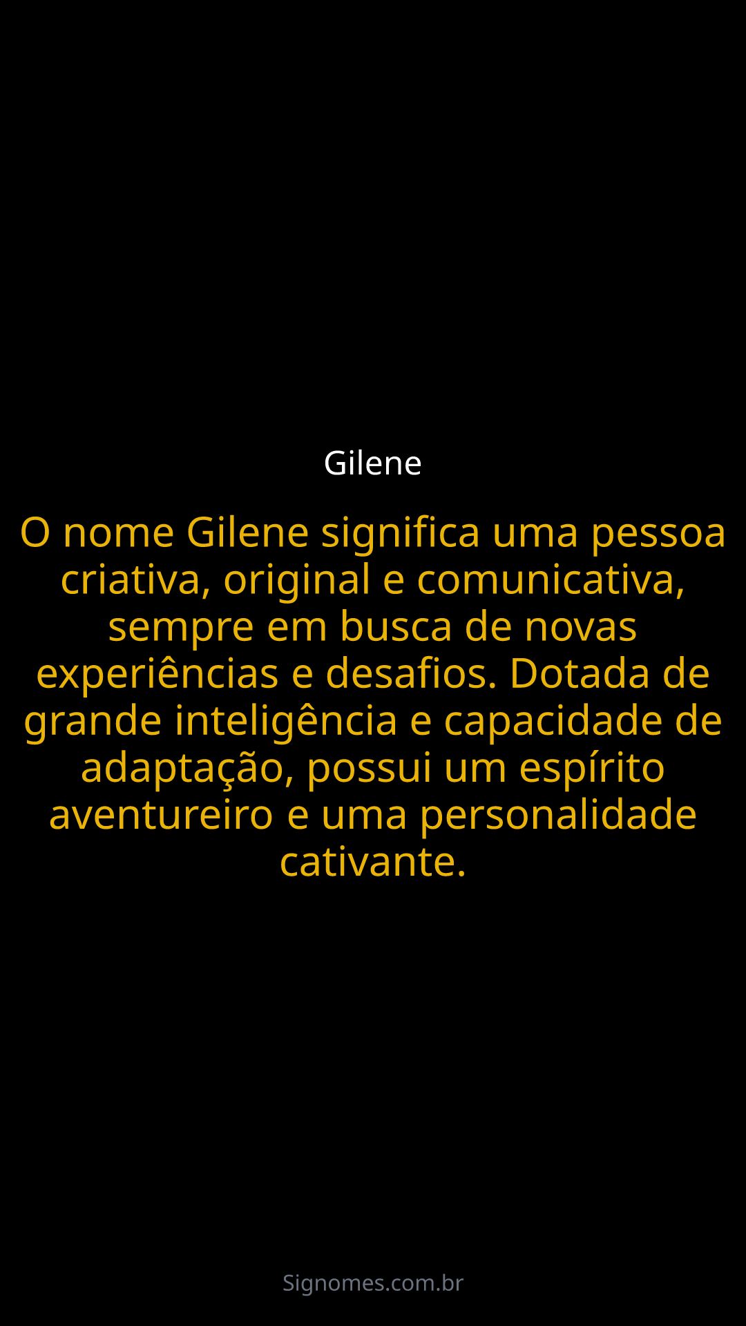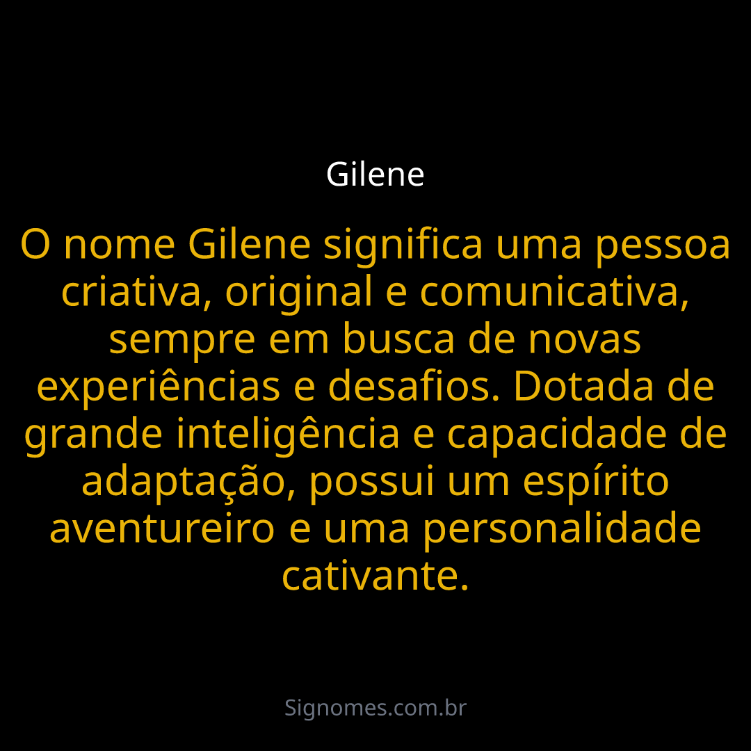 O nome Gilene significa uma pessoa criativa, original e comunicativa, sempre em busca de novas experiências e desafios. Dotada de grande inteligência e capacidade de adaptação, possui um espírito aventureiro e uma personalidade cativante.