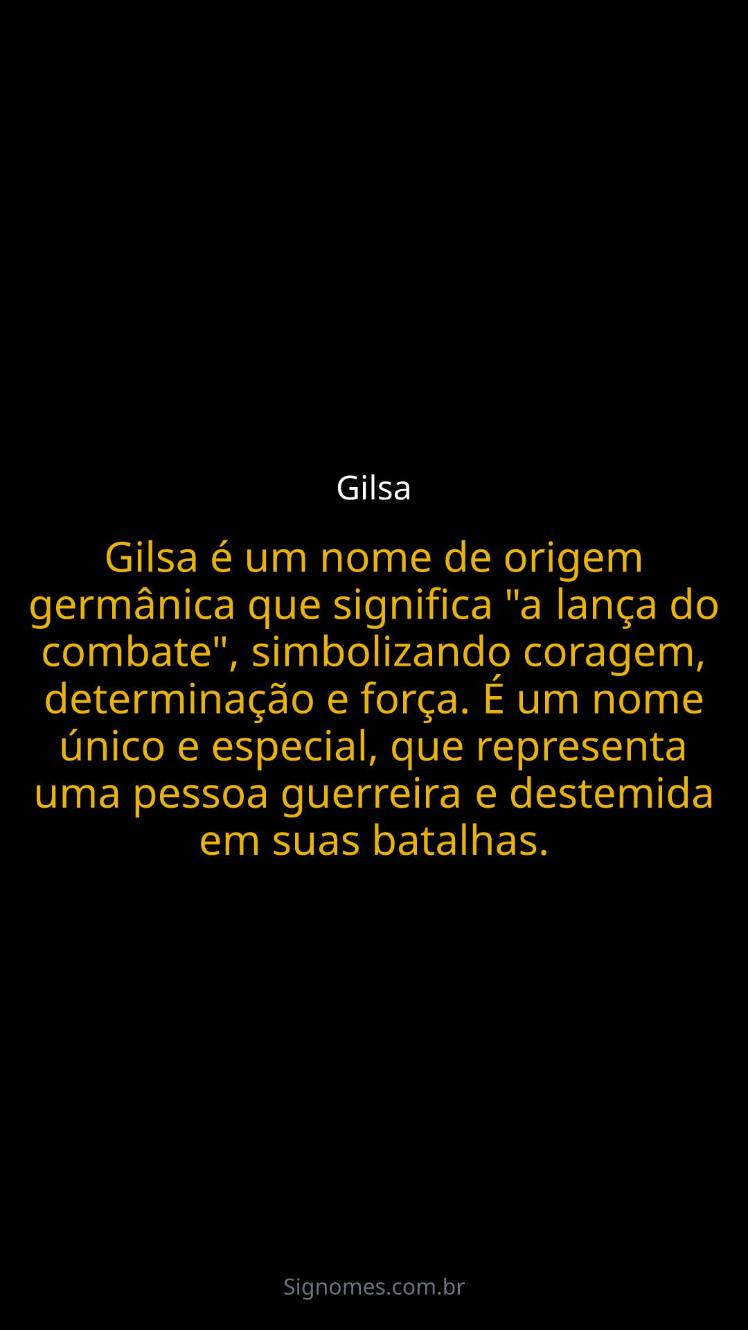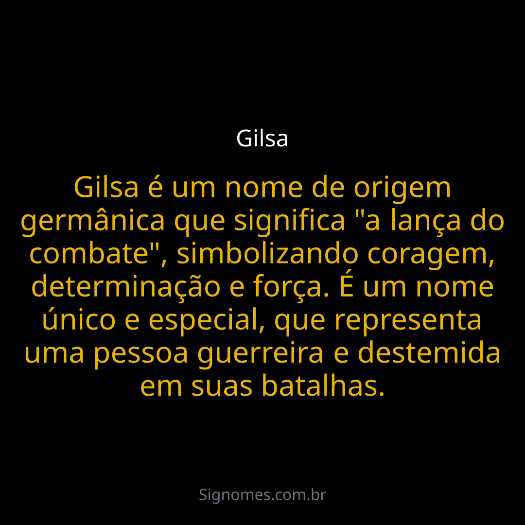 Gilsa é um nome de origem germânica que significa "a lança do combate", simbolizando coragem, determinação e força. É um nome único e especial, que representa uma pessoa guerreira e destemida em suas batalhas.