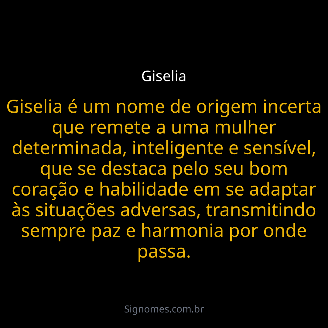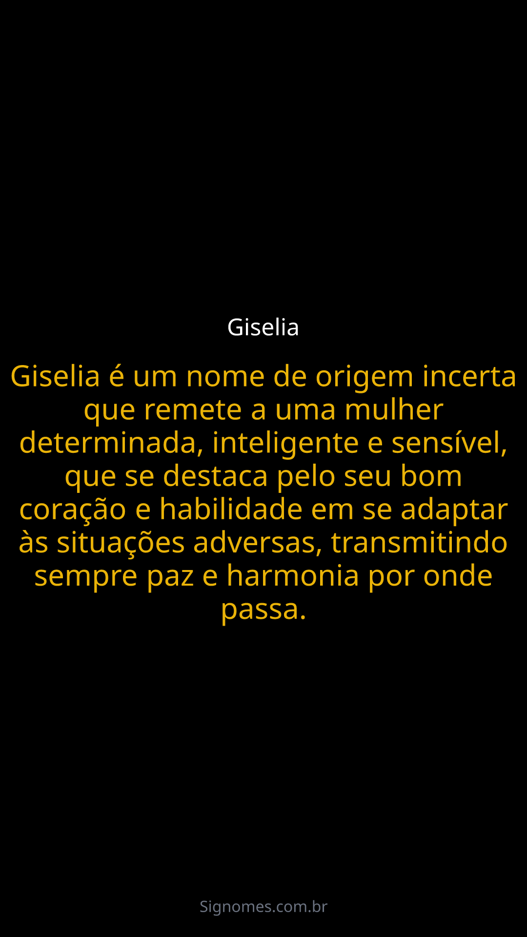 Giselia é um nome de origem incerta que remete a uma mulher determinada, inteligente e sensível, que se destaca pelo seu bom coração e habilidade em se adaptar às situações adversas, transmitindo sempre paz e harmonia por onde passa.