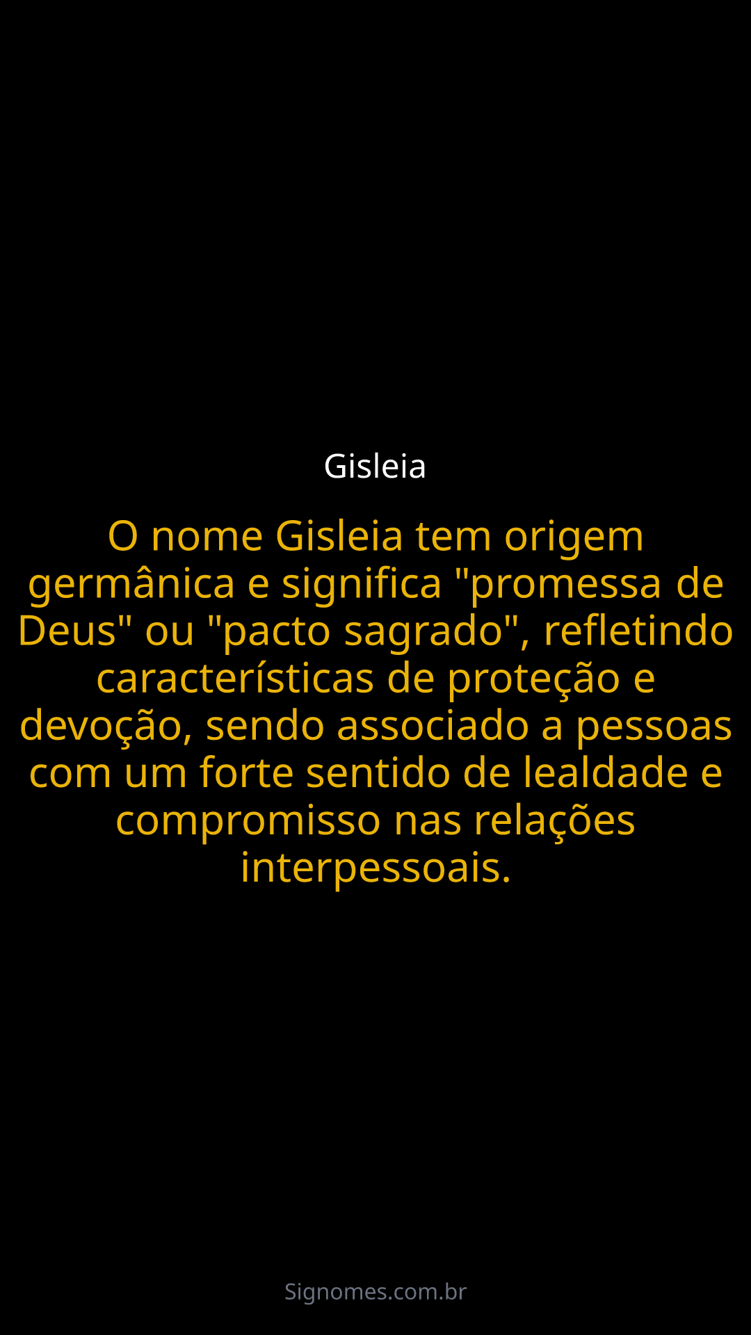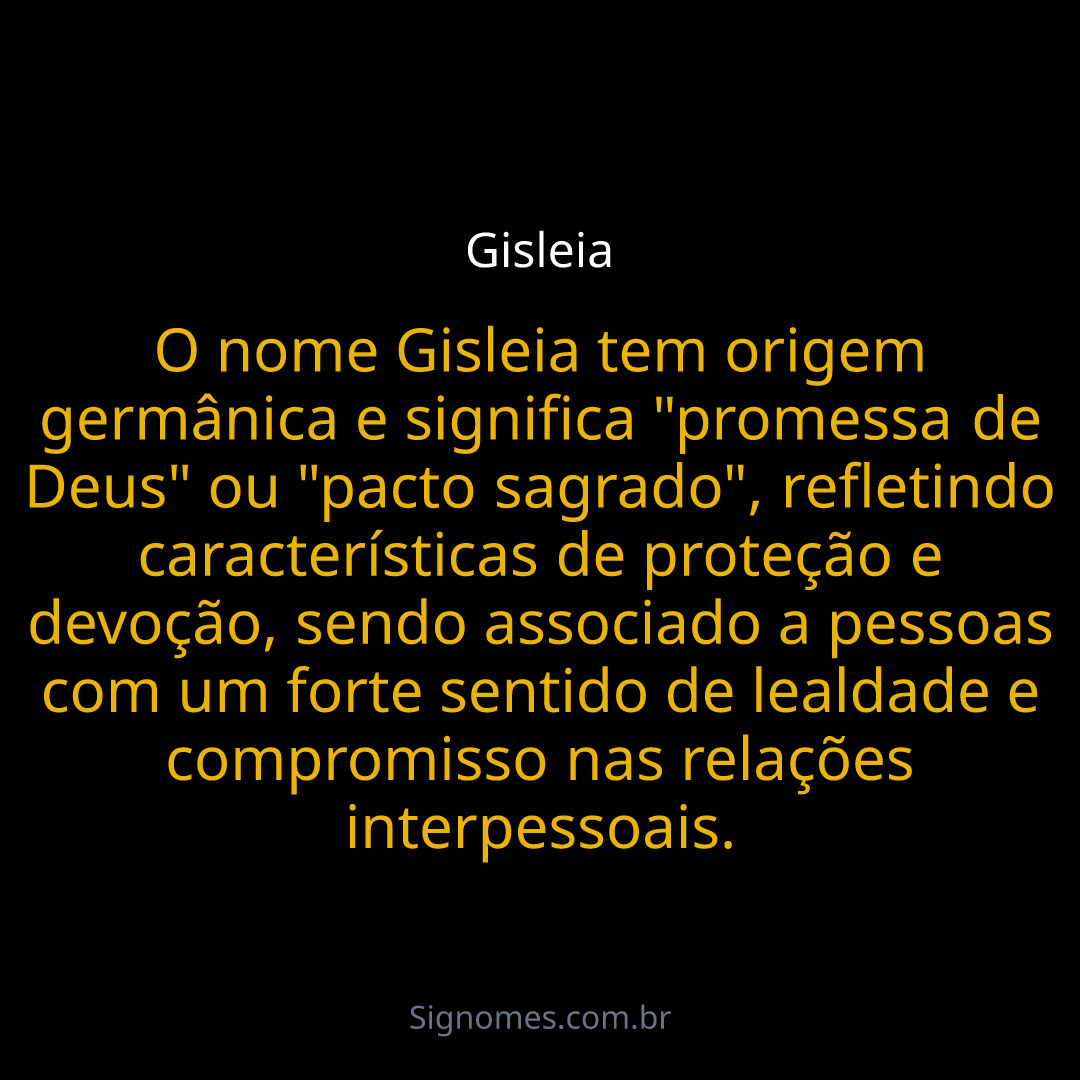 O nome Gisleia tem origem germânica e significa "promessa de Deus" ou "pacto sagrado", refletindo características de proteção e devoção, sendo associado a pessoas com um forte sentido de lealdade e compromisso nas relações interpessoais.