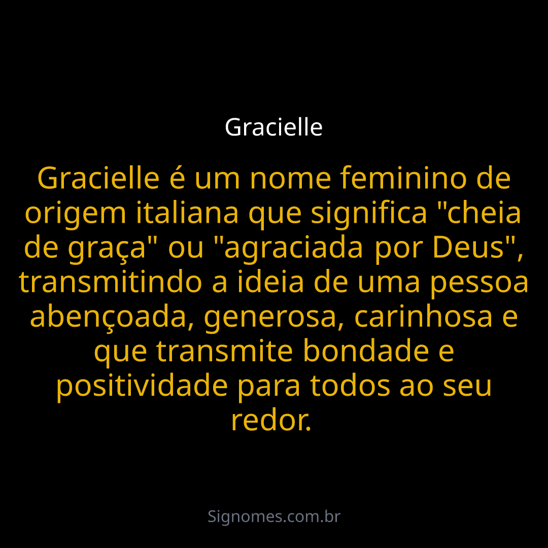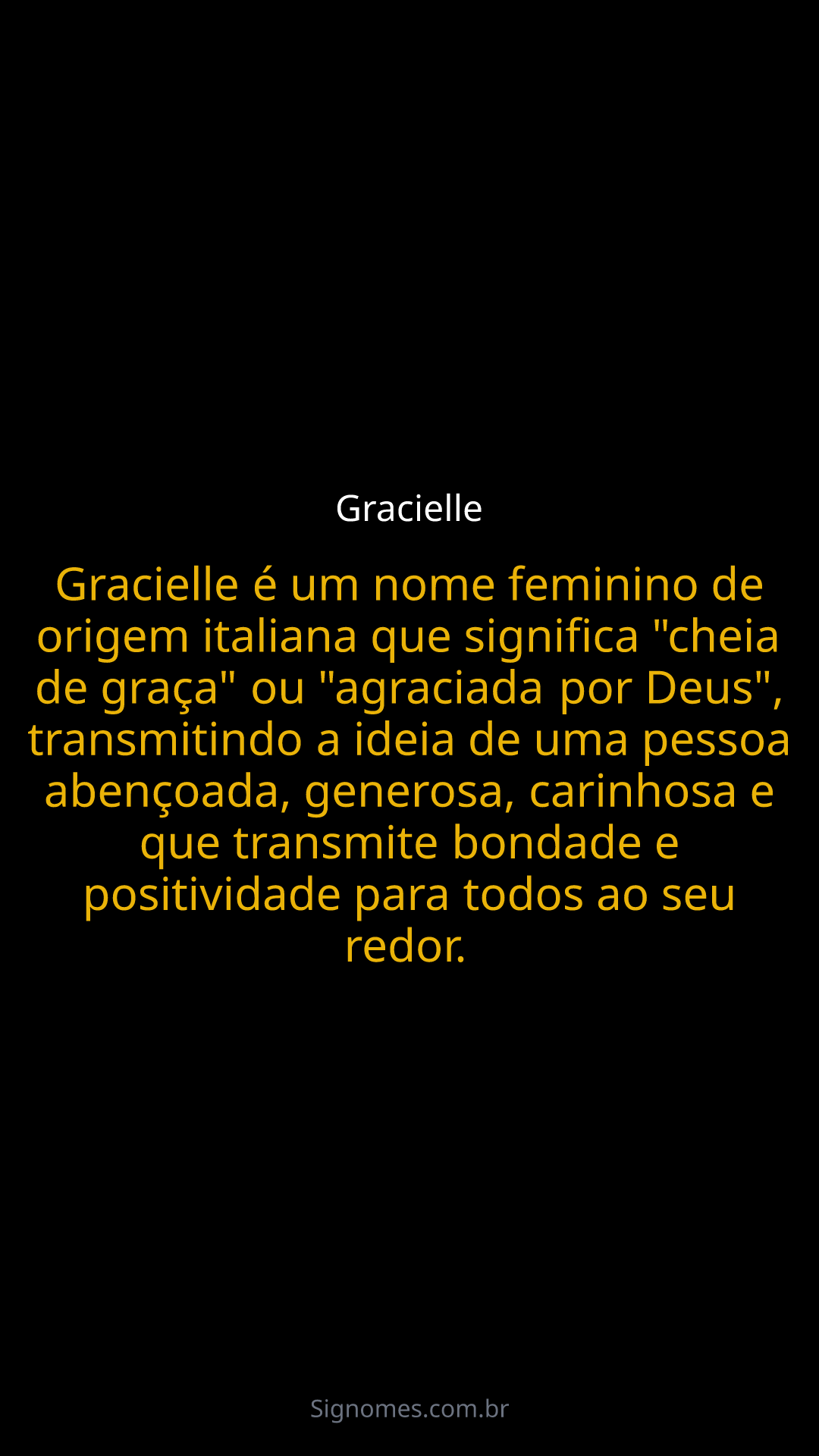 Gracielle é um nome feminino de origem italiana que significa "cheia de graça" ou "agraciada por Deus", transmitindo a ideia de uma pessoa abençoada, generosa, carinhosa e que transmite bondade e positividade para todos ao seu redor.