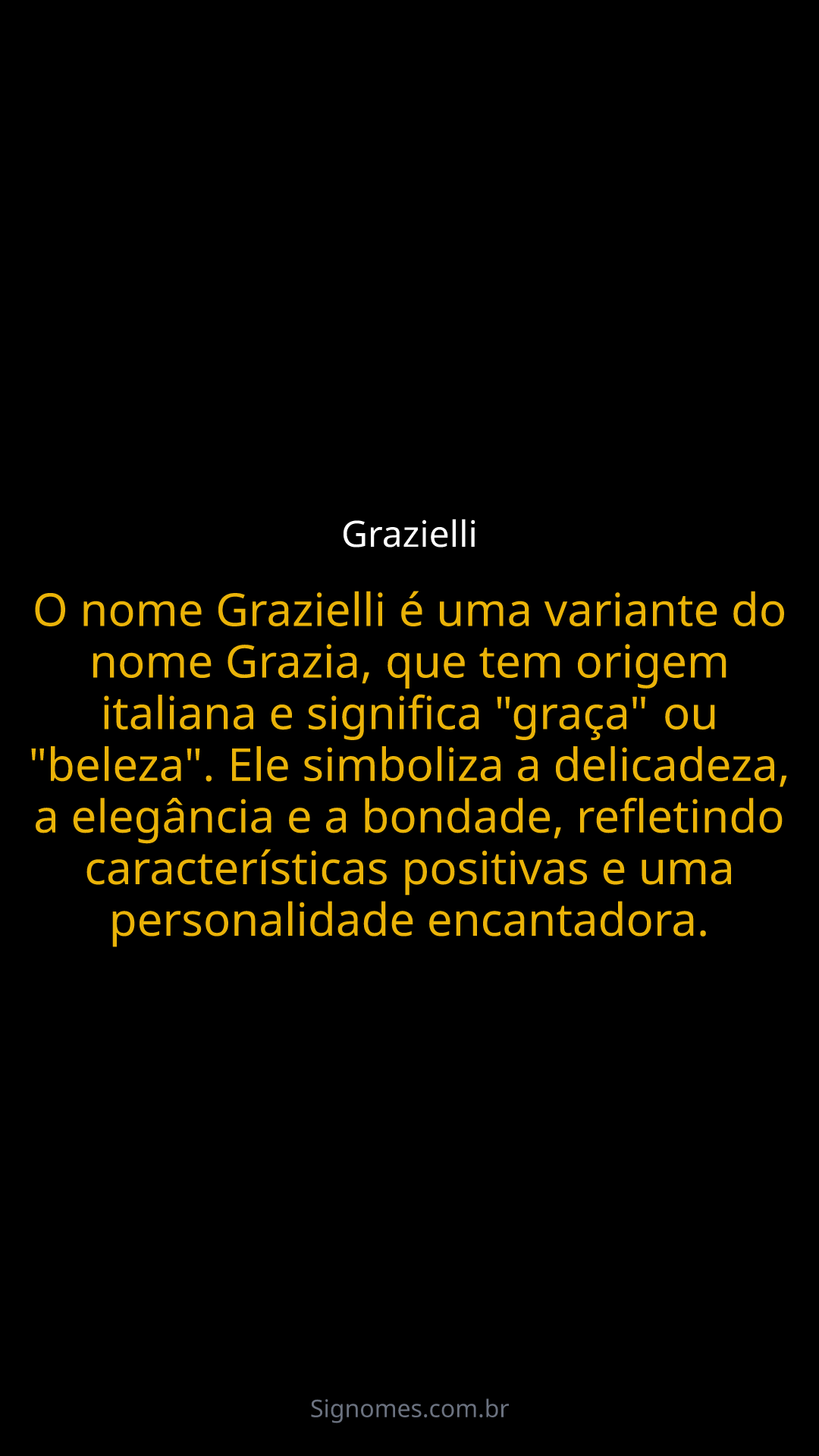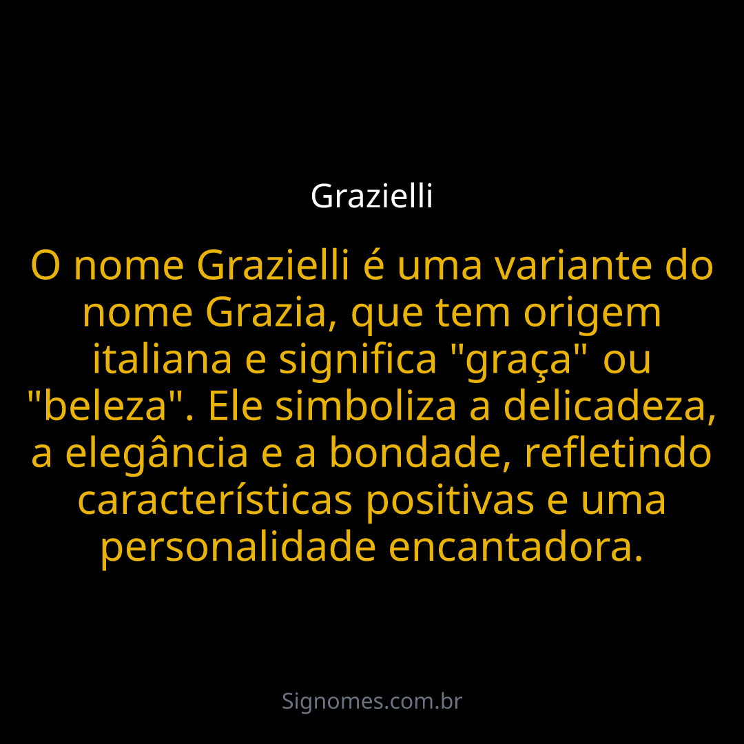 O nome Grazielli é uma variante do nome Grazia, que tem origem italiana e significa "graça" ou "beleza". Ele simboliza a delicadeza, a elegância e a bondade, refletindo características positivas e uma personalidade encantadora.