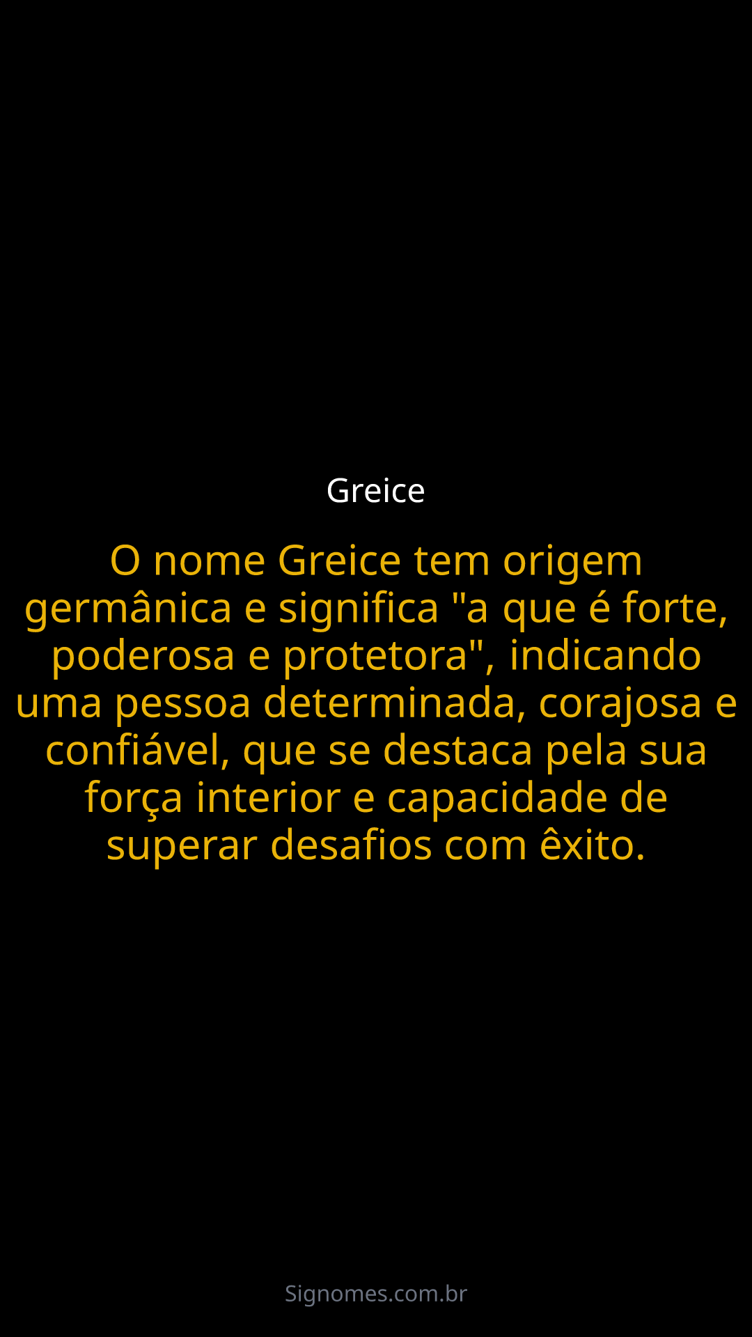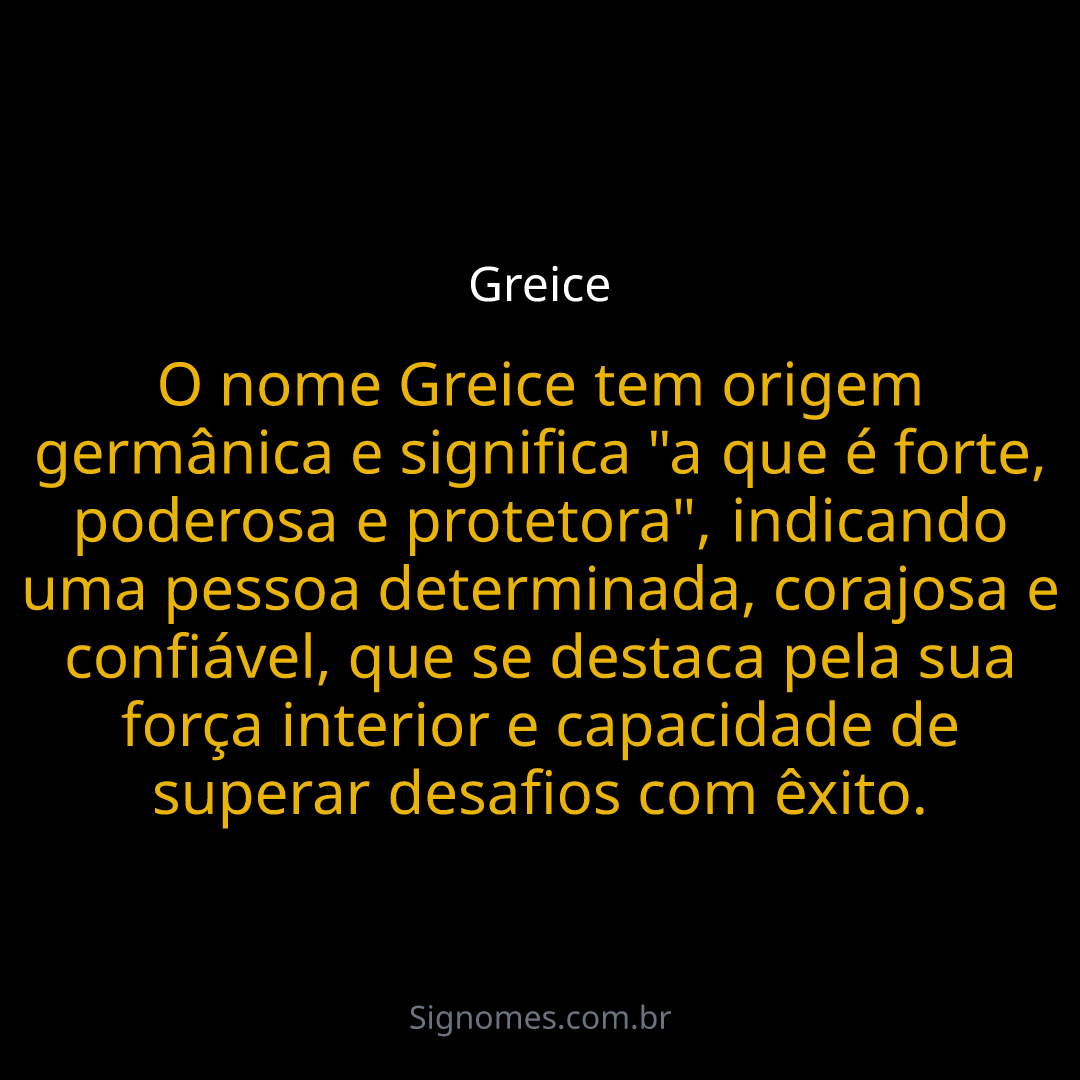 O nome Greice tem origem germânica e significa "a que é forte, poderosa e protetora", indicando uma pessoa determinada, corajosa e confiável, que se destaca pela sua força interior e capacidade de superar desafios com êxito.