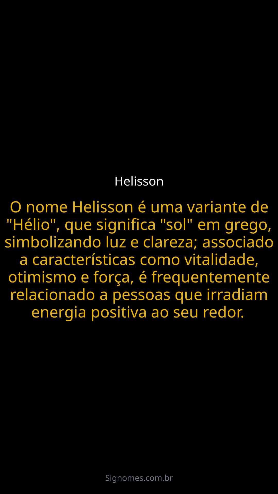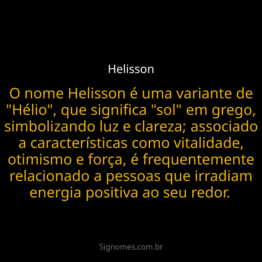 O nome Helisson é uma variante de "Hélio", que significa "sol" em grego, simbolizando luz e clareza; associado a características como vitalidade, otimismo e força, é frequentemente relacionado a pessoas que irradiam energia positiva ao seu redor.
