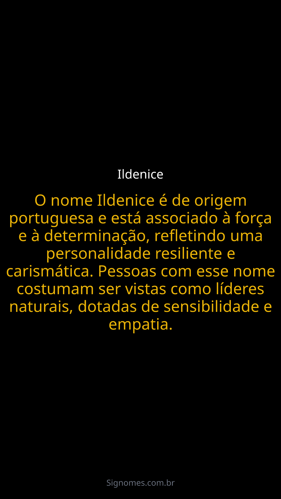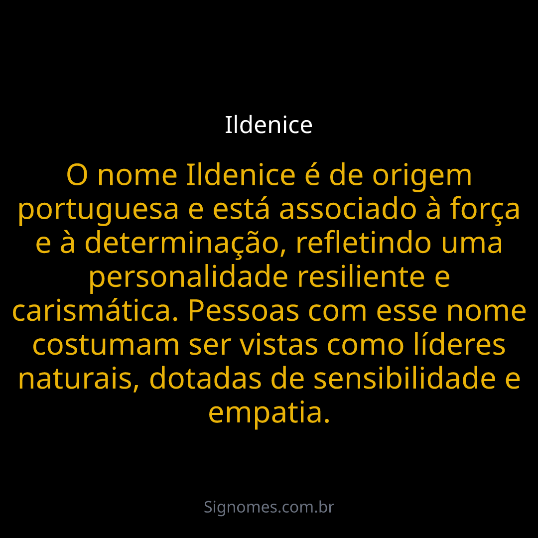 O nome Ildenice é de origem portuguesa e está associado à força e à determinação, refletindo uma personalidade resiliente e carismática. Pessoas com esse nome costumam ser vistas como líderes naturais, dotadas de sensibilidade e empatia.
