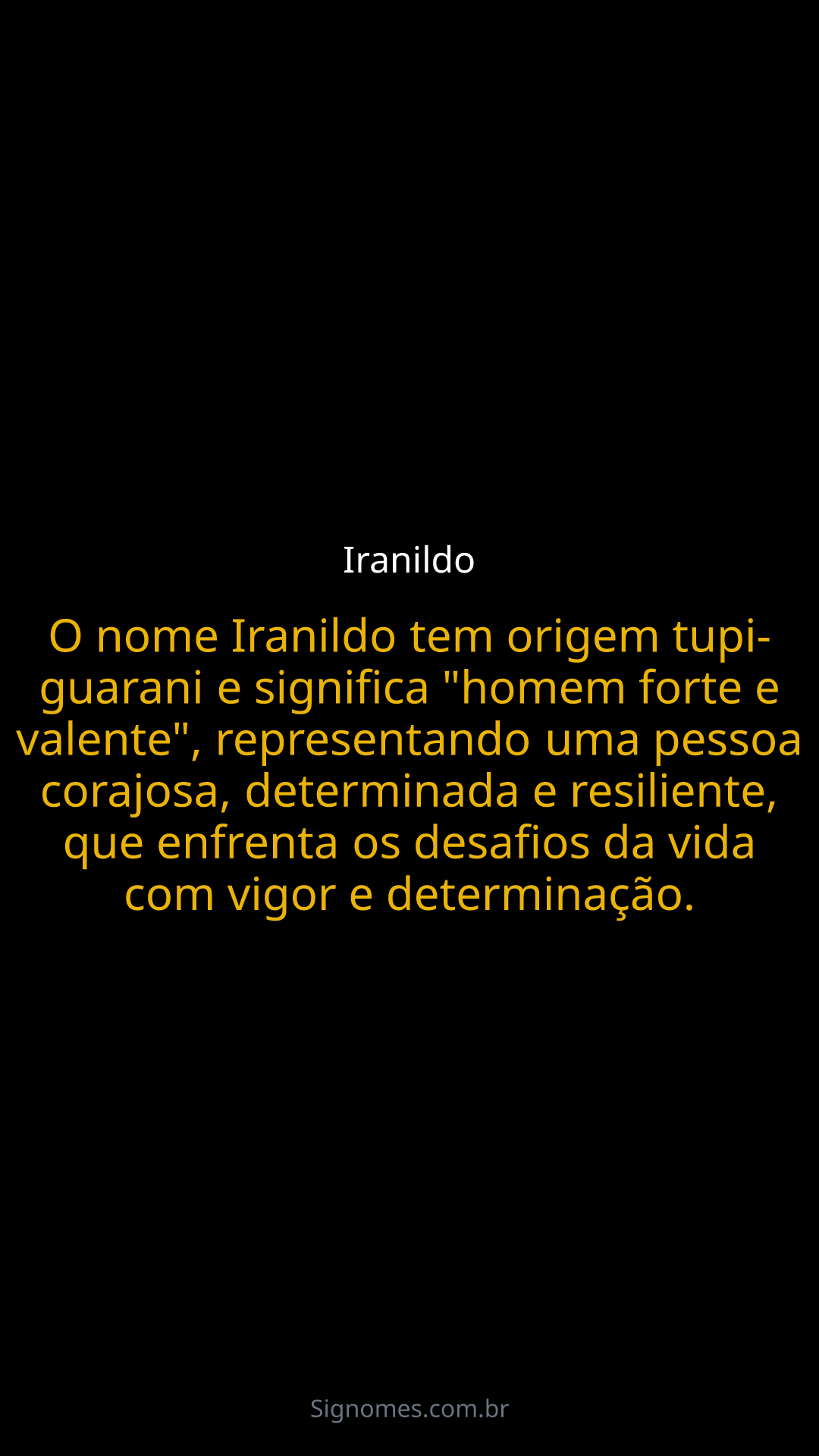 O nome Iranildo tem origem tupi-guarani e significa "homem forte e valente", representando uma pessoa corajosa, determinada e resiliente, que enfrenta os desafios da vida com vigor e determinação.