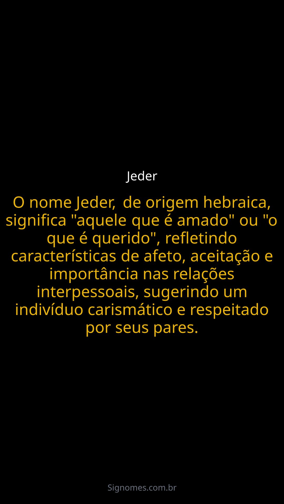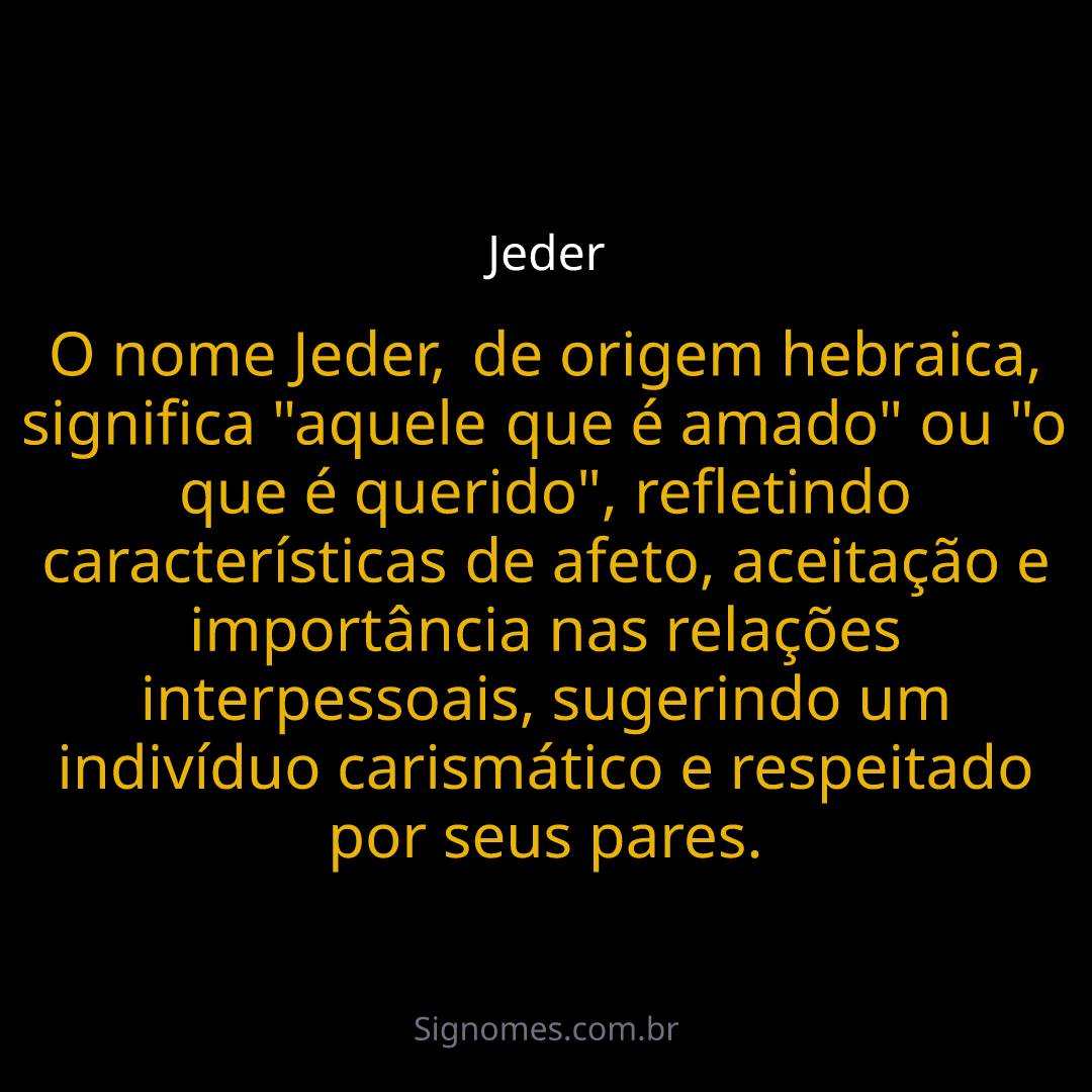 O nome Jeder, de origem hebraica, significa "aquele que é amado" ou "o que é querido", refletindo características de afeto, aceitação e importância nas relações interpessoais, sugerindo um indivíduo carismático e respeitado por seus pares.