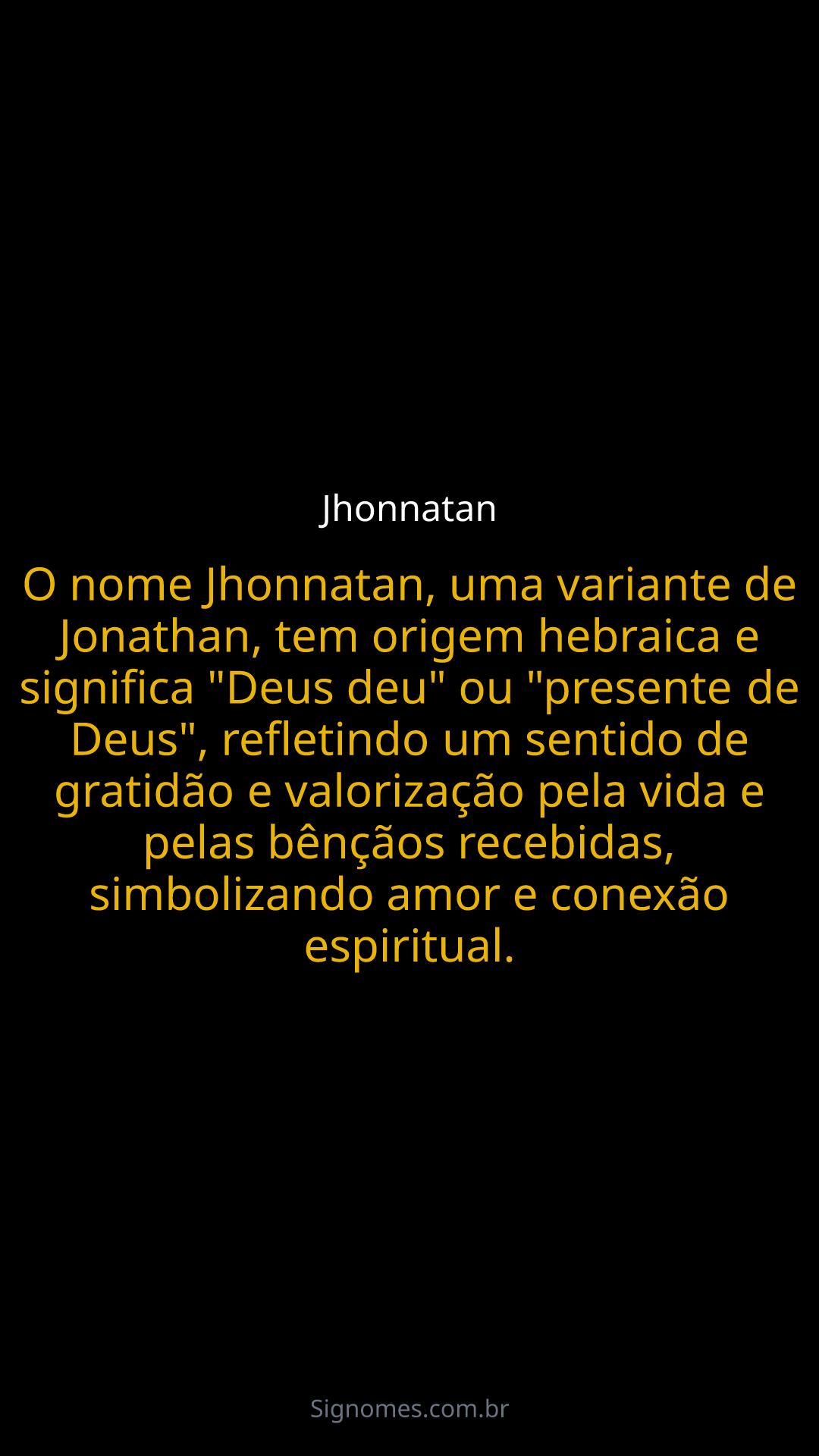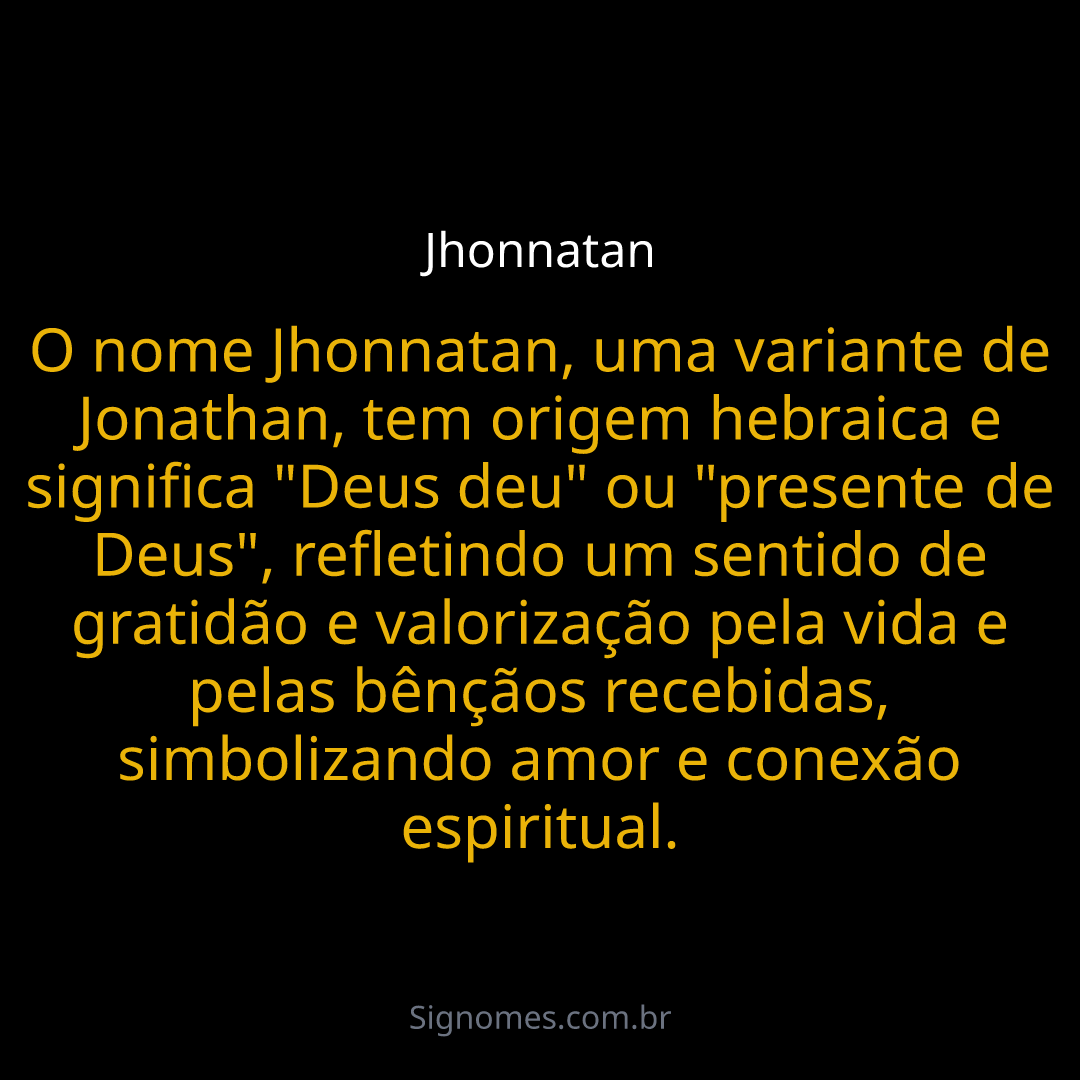 O nome Jhonnatan, uma variante de Jonathan, tem origem hebraica e significa "Deus deu" ou "presente de Deus", refletindo um sentido de gratidão e valorização pela vida e pelas bênçãos recebidas, simbolizando amor e conexão espiritual.