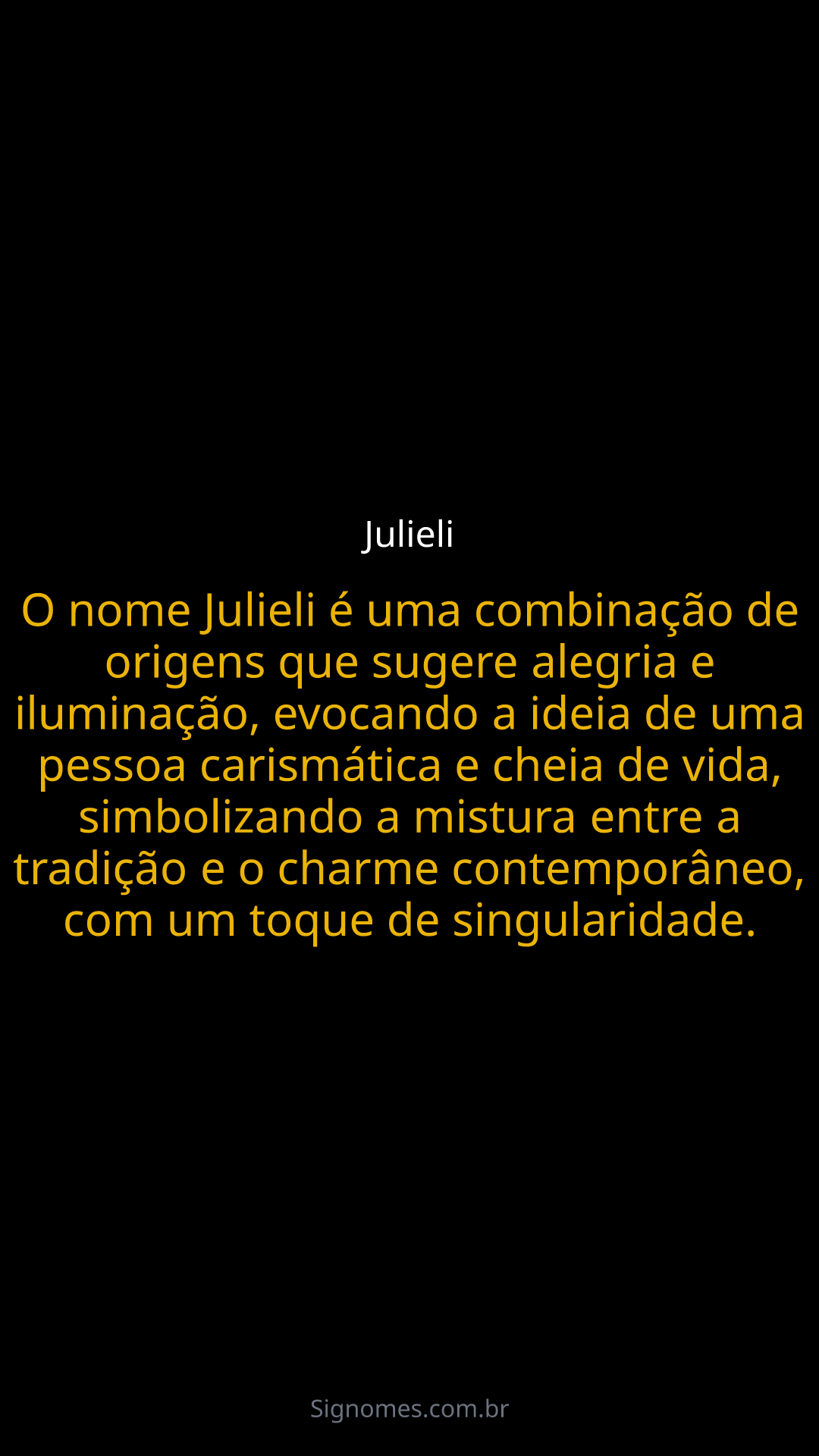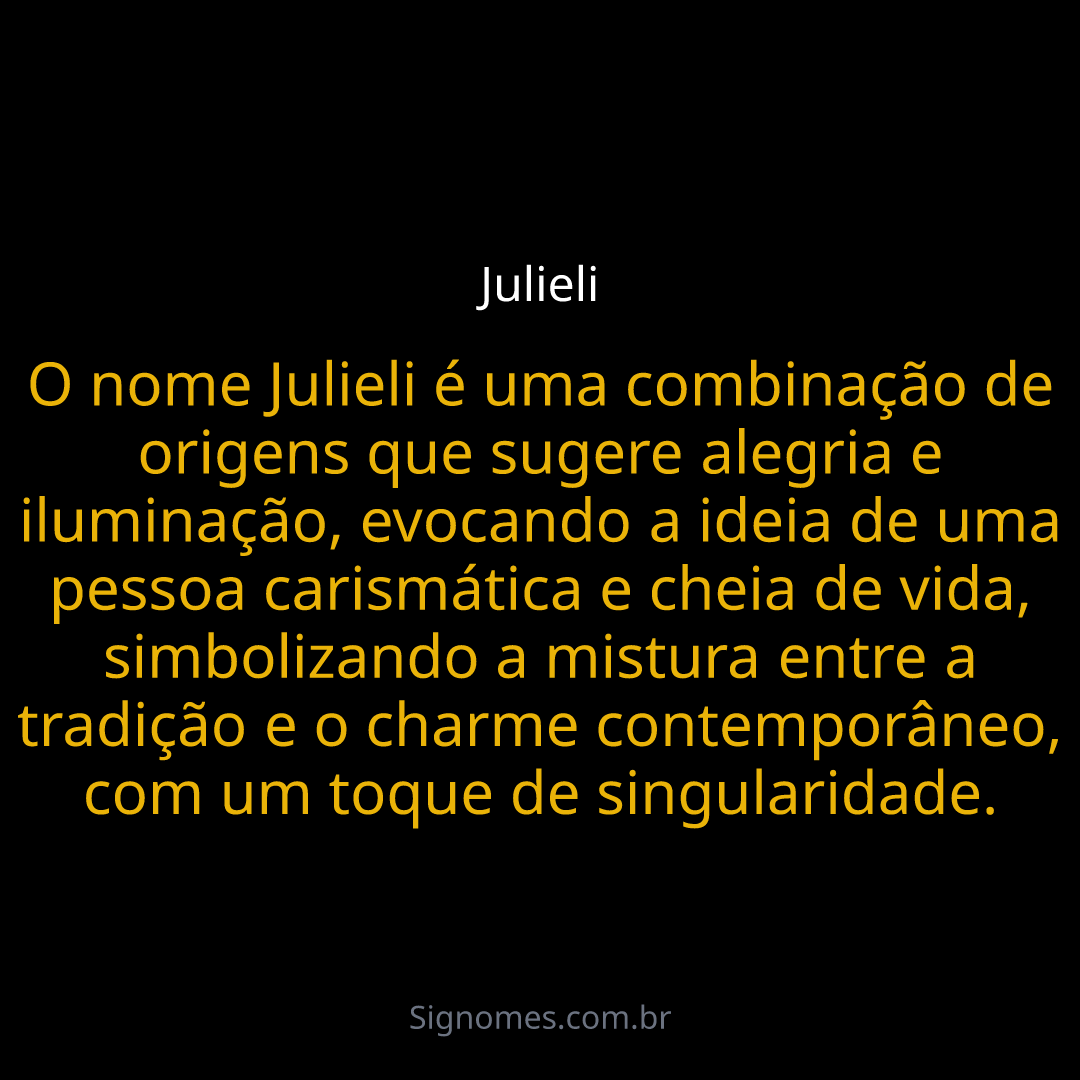 O nome Julieli é uma combinação de origens que sugere alegria e iluminação, evocando a ideia de uma pessoa carismática e cheia de vida, simbolizando a mistura entre a tradição e o charme contemporâneo, com um toque de singularidade.