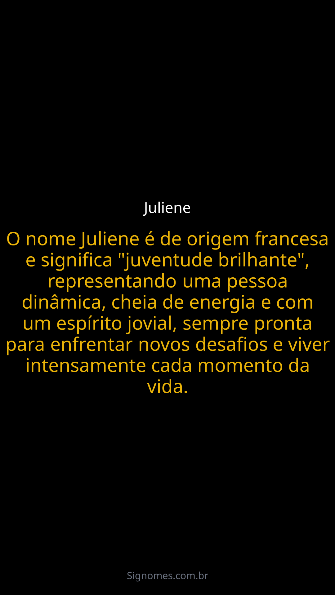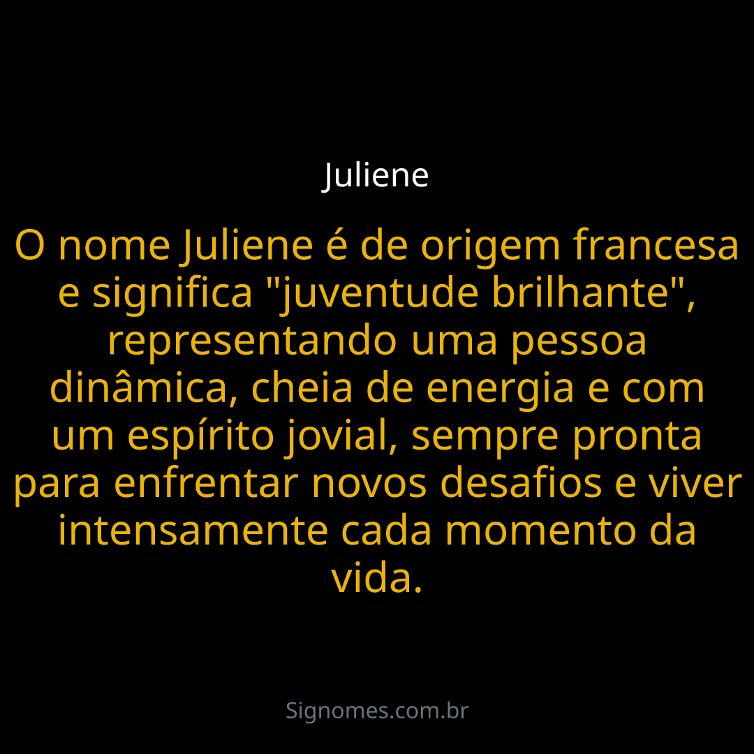 O nome Juliene é de origem francesa e significa "juventude brilhante", representando uma pessoa dinâmica, cheia de energia e com um espírito jovial, sempre pronta para enfrentar novos desafios e viver intensamente cada momento da vida.
