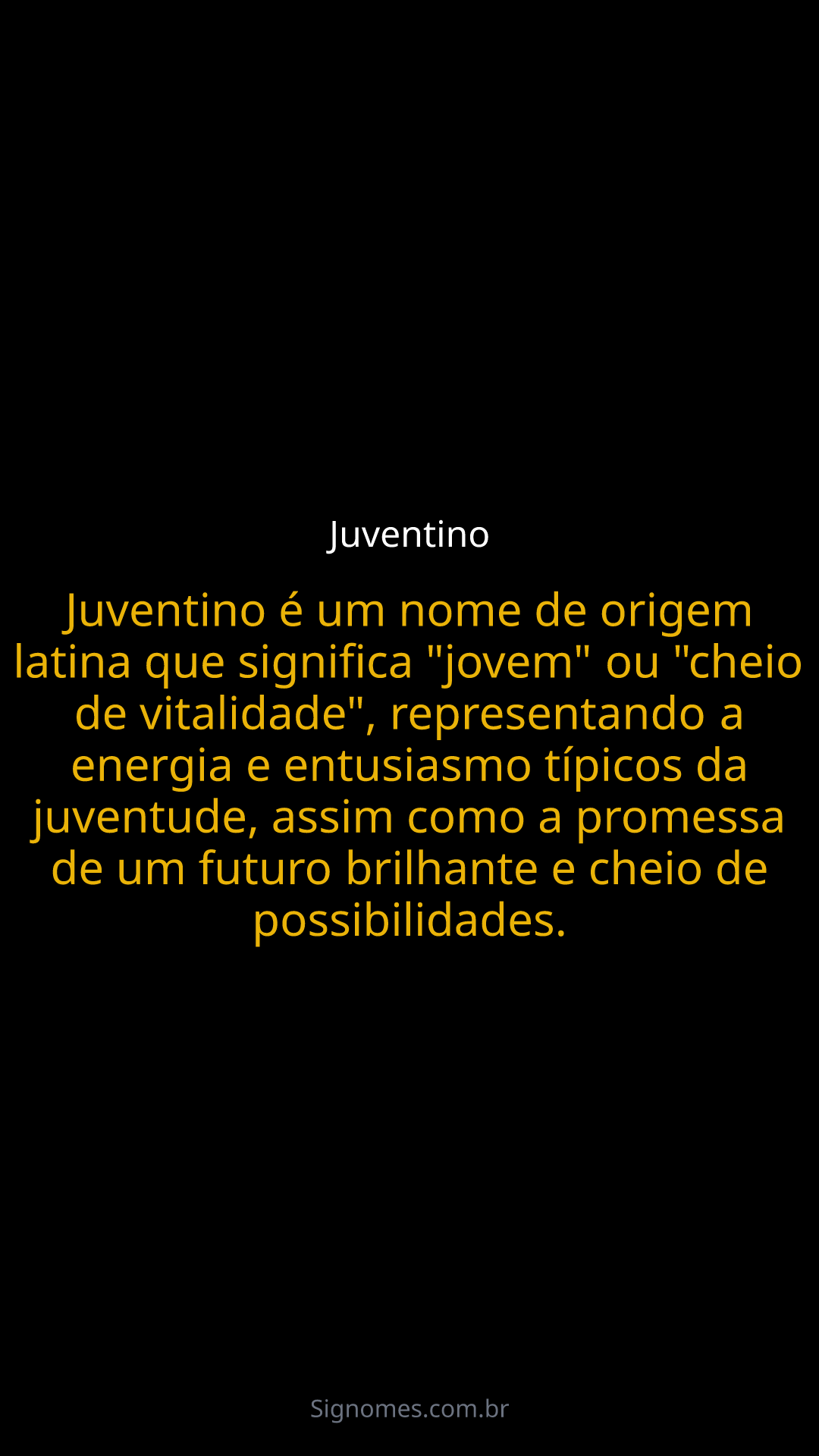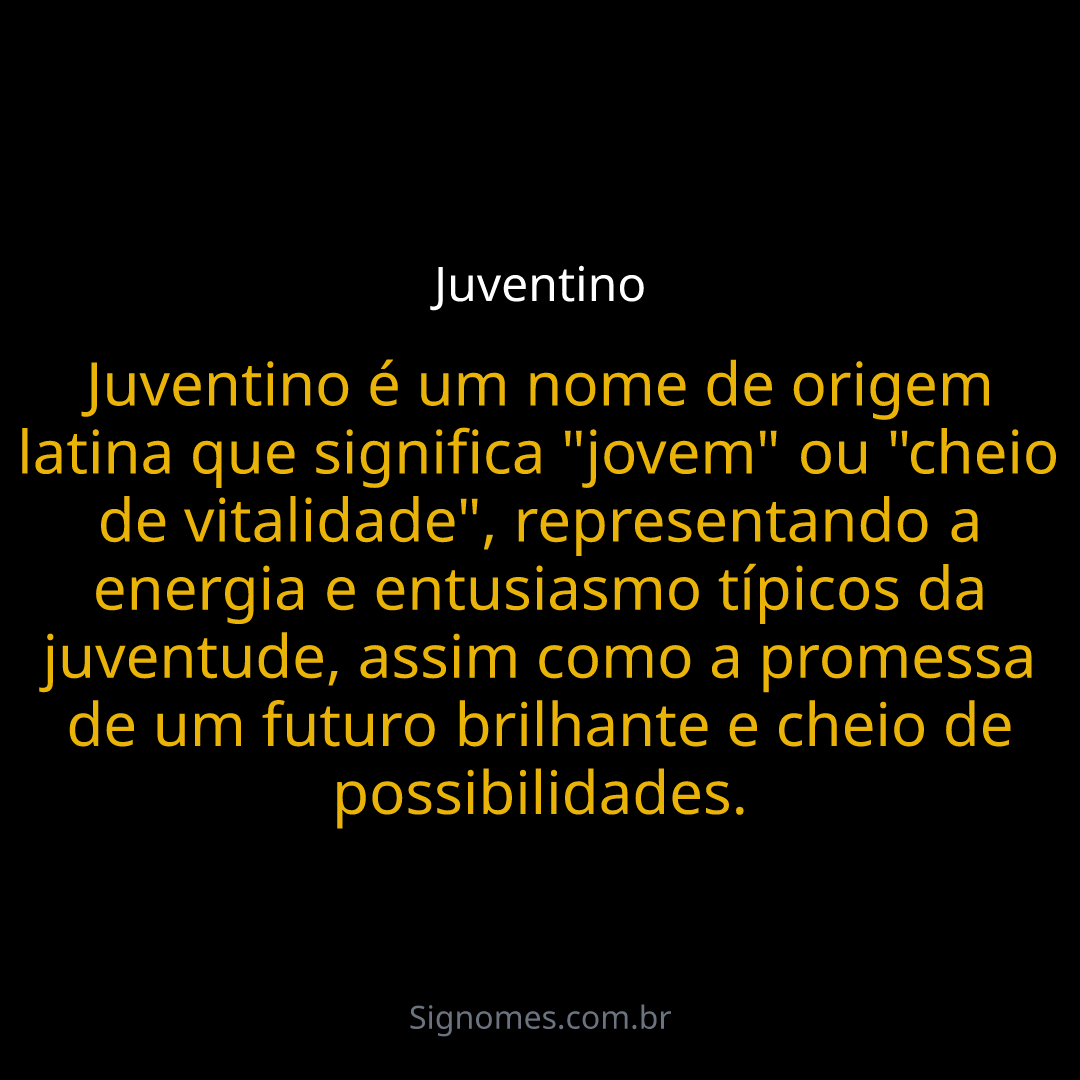 Juventino é um nome de origem latina que significa "jovem" ou "cheio de vitalidade", representando a energia e entusiasmo típicos da juventude, assim como a promessa de um futuro brilhante e cheio de possibilidades.