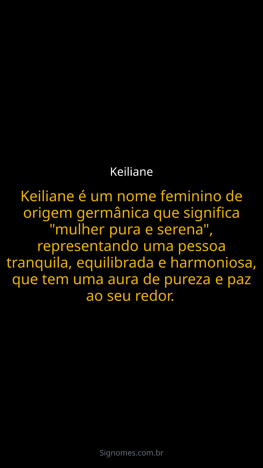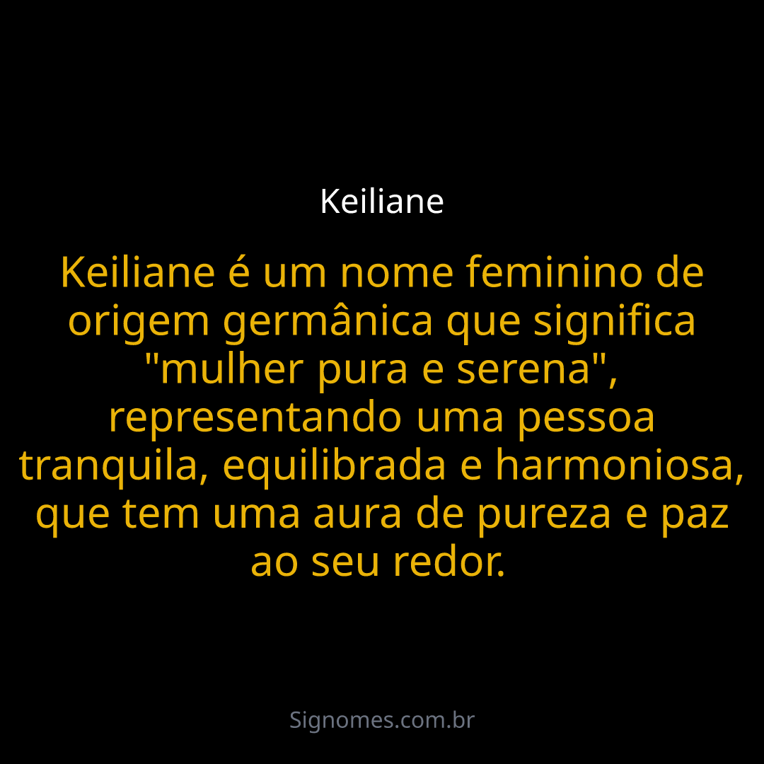 Keiliane é um nome feminino de origem germânica que significa "mulher pura e serena", representando uma pessoa tranquila, equilibrada e harmoniosa, que tem uma aura de pureza e paz ao seu redor.