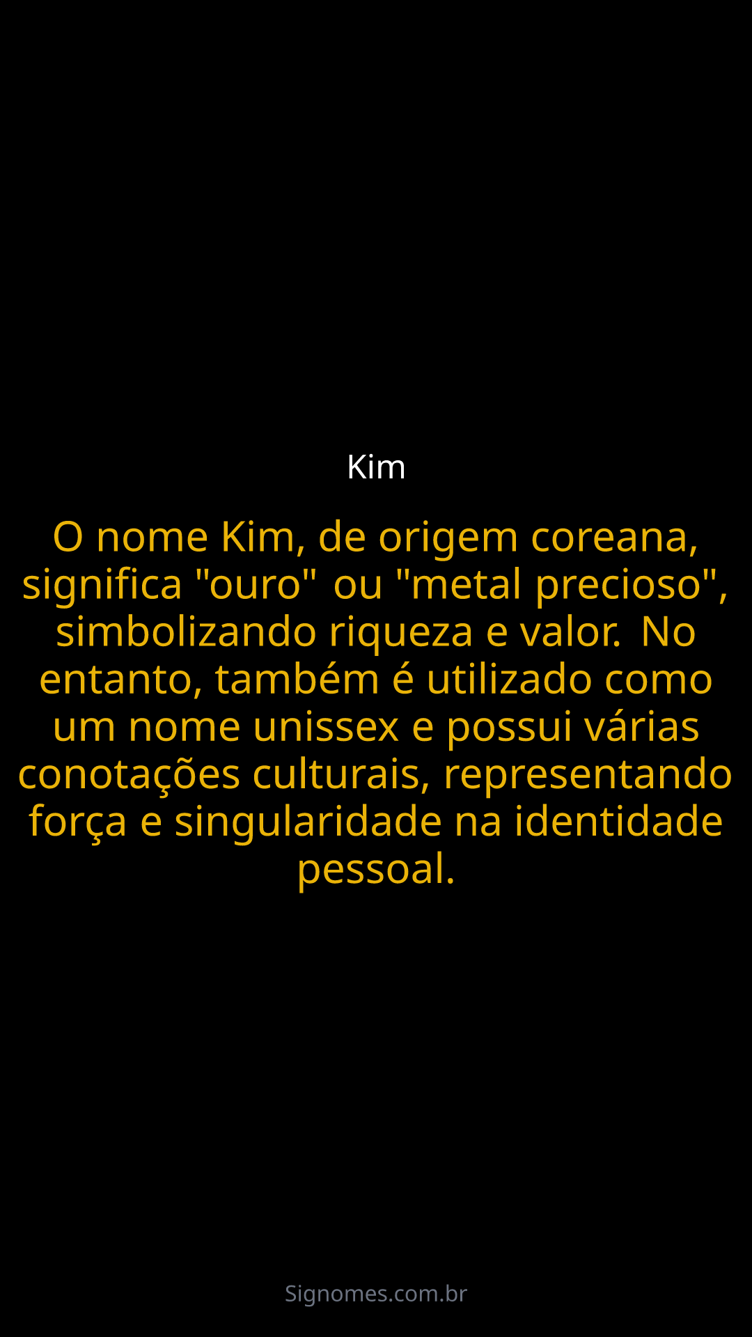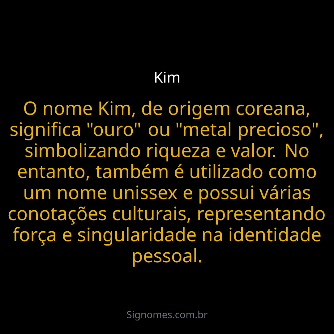 O nome Kim, de origem coreana, significa "ouro" ou "metal precioso", simbolizando riqueza e valor. No entanto, também é utilizado como um nome unissex e possui várias conotações culturais, representando força e singularidade na identidade pessoal.