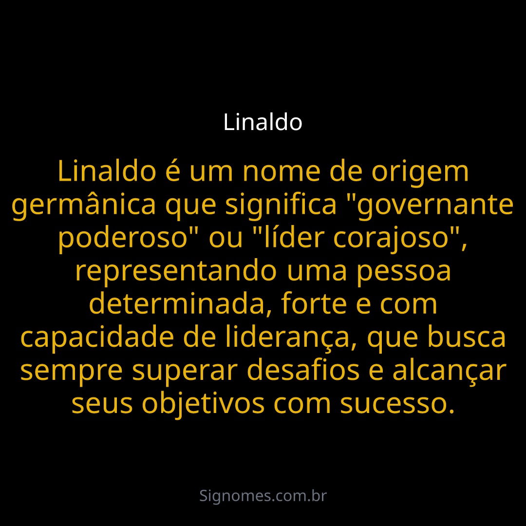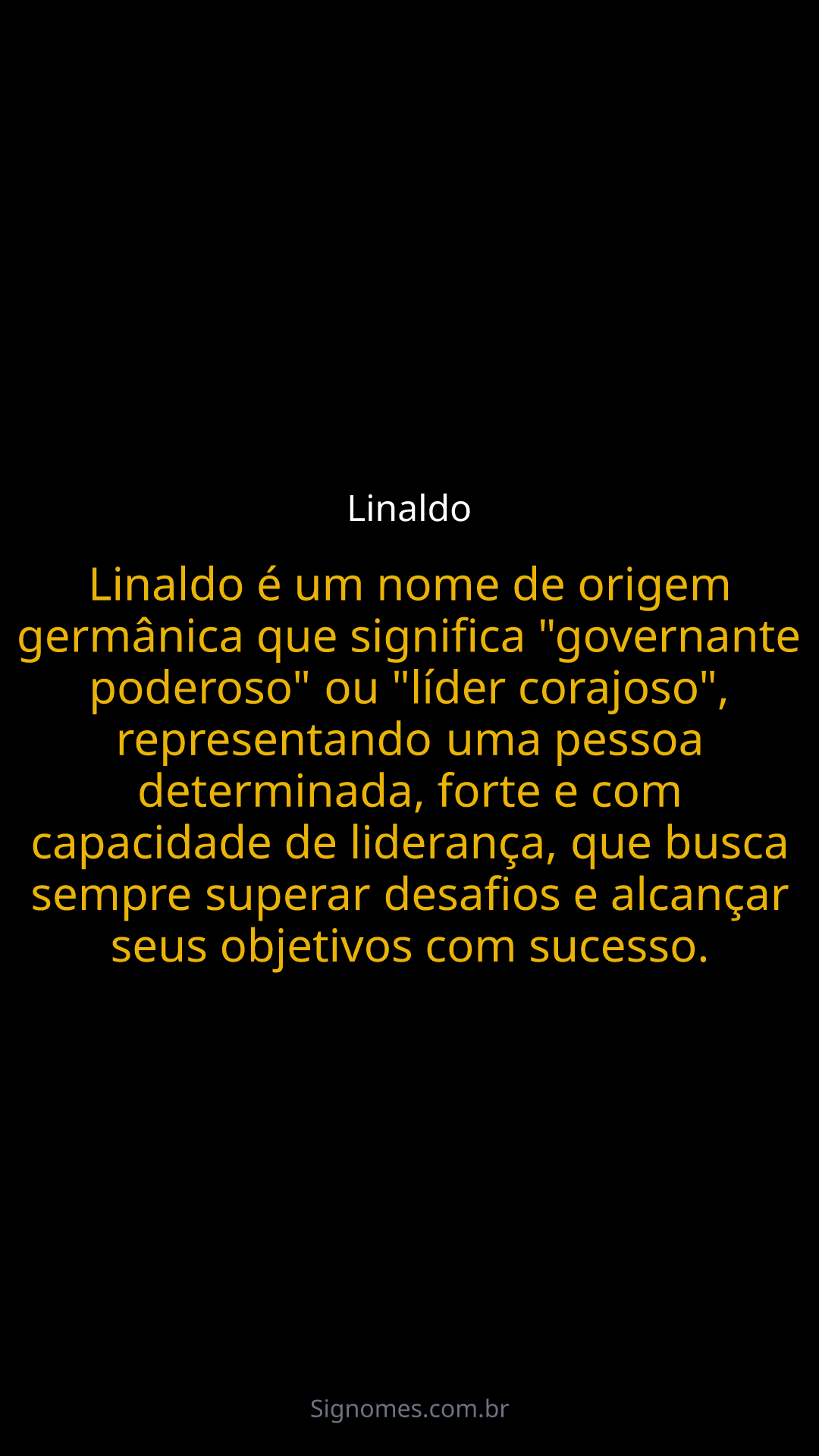 Linaldo é um nome de origem germânica que significa "governante poderoso" ou "líder corajoso", representando uma pessoa determinada, forte e com capacidade de liderança, que busca sempre superar desafios e alcançar seus objetivos com sucesso.