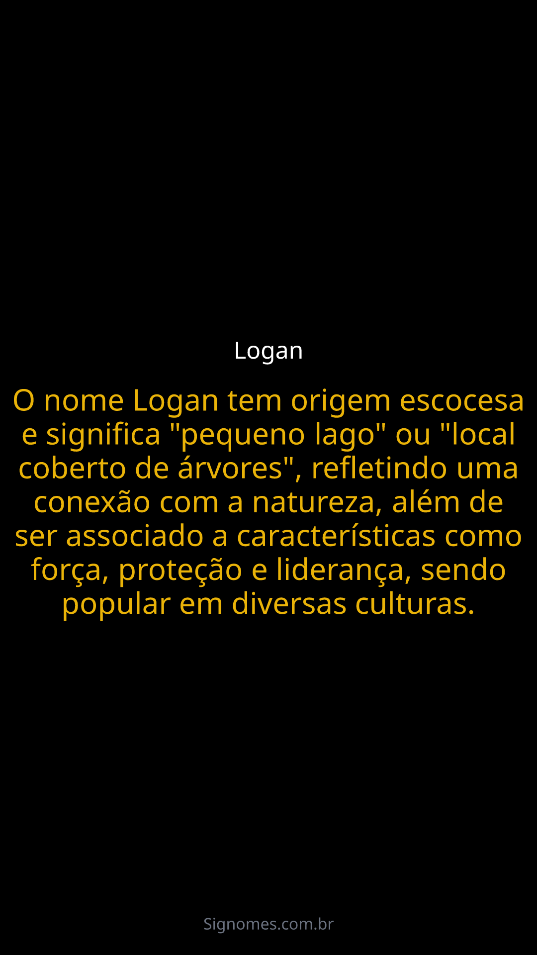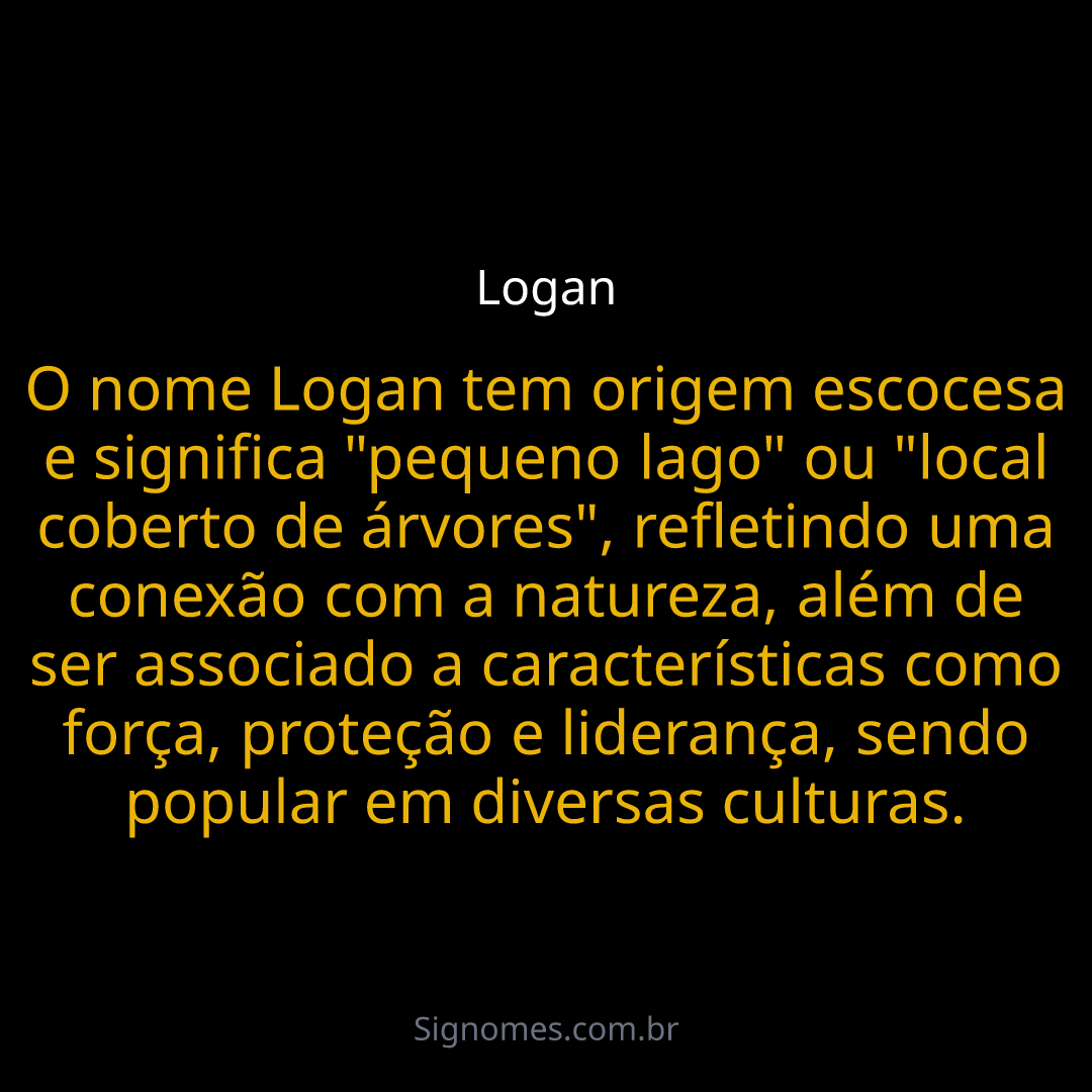 O nome Logan tem origem escocesa e significa "pequeno lago" ou "local coberto de árvores", refletindo uma conexão com a natureza, além de ser associado a características como força, proteção e liderança, sendo popular em diversas culturas.