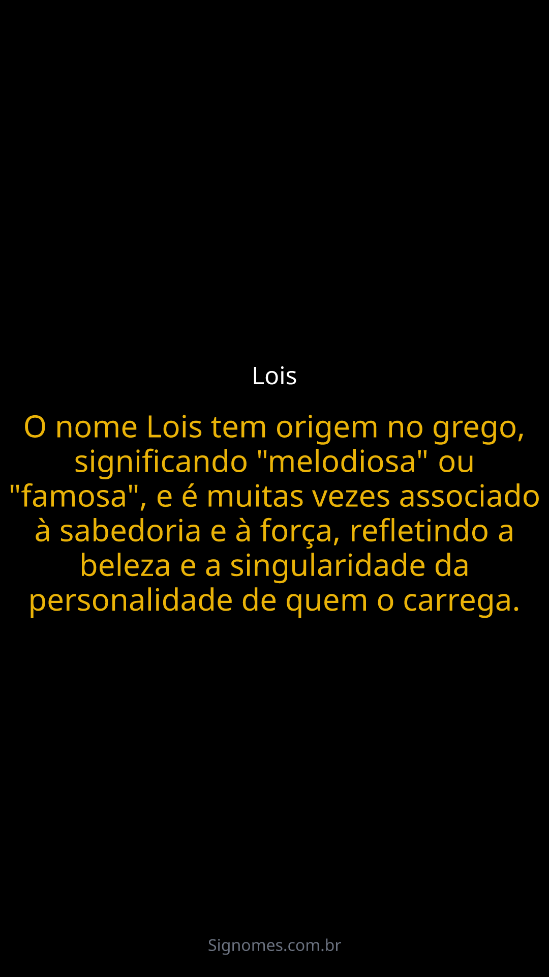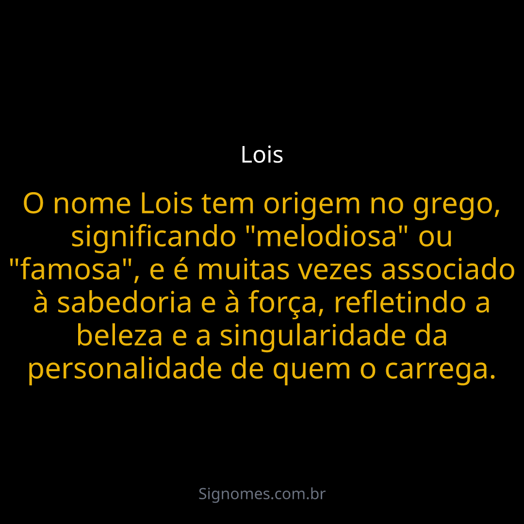 O nome Lois tem origem no grego, significando "melodiosa" ou "famosa", e é muitas vezes associado à sabedoria e à força, refletindo a beleza e a singularidade da personalidade de quem o carrega.